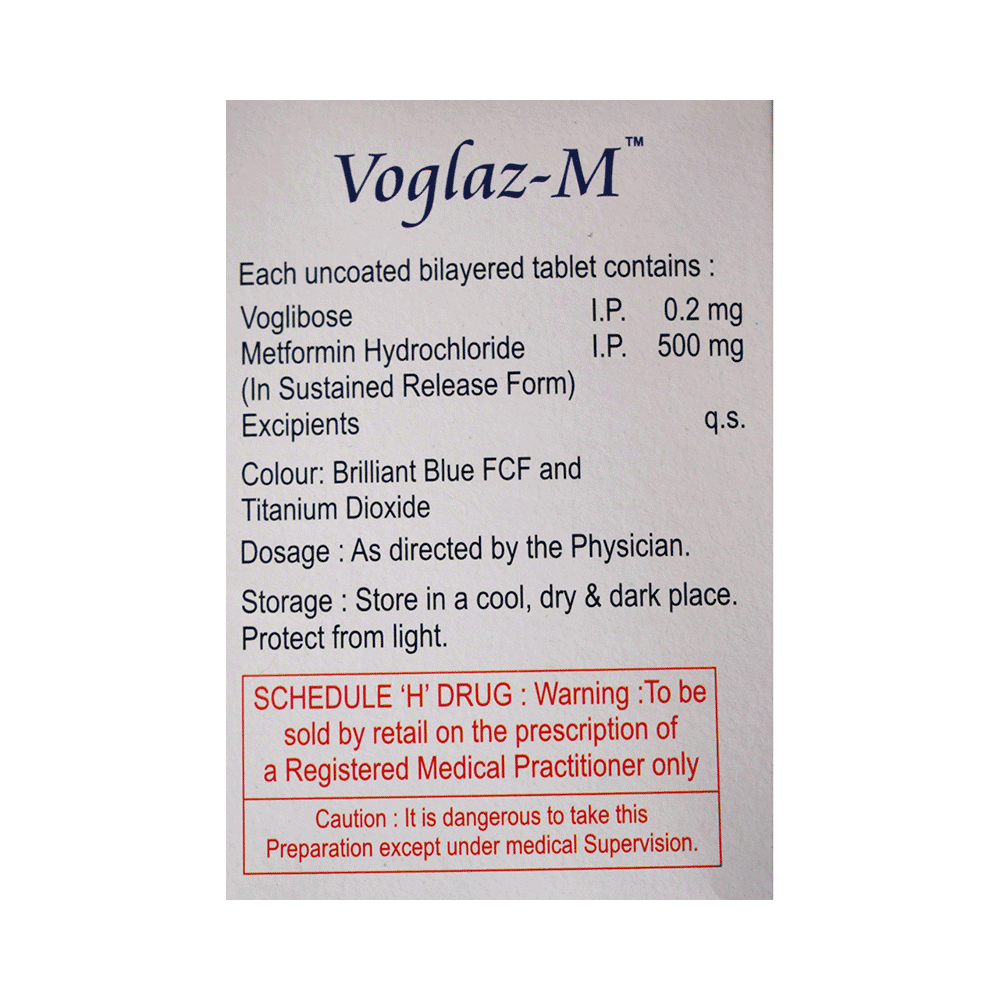 Voglaz-M Tablet SR belongs to a category of medicines known as anti-diabetic drugs. It is a combination of medicines used to treat type 2 diabetes mellitus in adults. It helps control blood sugar levels in people with diabetes. Voglaz-M Tablet SR should be taken with food. Take it regularly at the same time each day to get the most benefit. Your doctor will decide what dose is best for you and this may change from time to time according to how it is working according to your blood sugar levels.Keep taking this medicine, even if you feel well or your blood sugar levels are controlled. If you stop it without consulting your doctor, your blood sugar levels could rise and put you at risk of kidney damage, blindness, nerve problems and loss of limbs. Remember that it is only part of a treatment program that should also include a healthy diet, regular exercise, and weight reduction as advised by your doctor. Your lifestyle plays a big part in controlling diabetes.This medicine may cause side effects like nausea, taste change, loss of appetite, flatulence, stomach pain, diarrhea, and skin rash. However, these are temporary and usually subside on their own. If these do not resolve or worry you, please consult your doctor. Your doctor might suggest ways of dealing with your side effects or treating them if they are bothersome.You should not take it if you have type 1 diabetes mellitus, if you have diabetic ketoacidosis (high levels of acid in your blood), or if you have severe kidney or liver disease. Before taking this medicine, tell your doctor if you have ever had heart disease. It may not be suitable. Pregnant or breastfeeding women should also consult their doctor before taking it. Your blood sugar levels should be checked regularly and your doctor may also advise blood tests to monitor your blood cell counts and liver function.