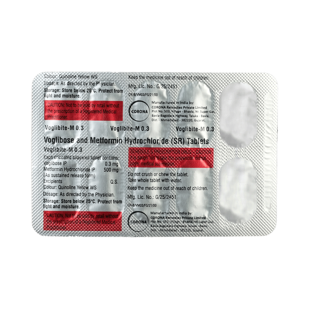 In Treatment of Type 2 diabetes mellitusVoglibite-M 0.3 Tablet SR is a medicine that helps to control high blood glucose (sugar) levels. It helps to slow down the breaking down of food in our intestine to simple glucose (sugar), thereby decreasing the rise in blood glucose levels after meals. It also helps get rid of extra glucose from your body through urine. Lowering blood glucose levels is an essential part of managing diabetes. If you can control the level, you will reduce the risk of getting any of the serious complications of diabetes such as kidney damage, eye damage, nerve problems and loss of limbs. Voglibite-M 0.3 Tablet SR will reduce the risk of dying from cardiovascular disease if you have type 2 diabetes and already have cardiovascular disease. Taking this medicine regularly along with proper diet and exercise will help you live a normal, healthy life. You should keep using it for as long as it is prescribed because it is protecting your future health.