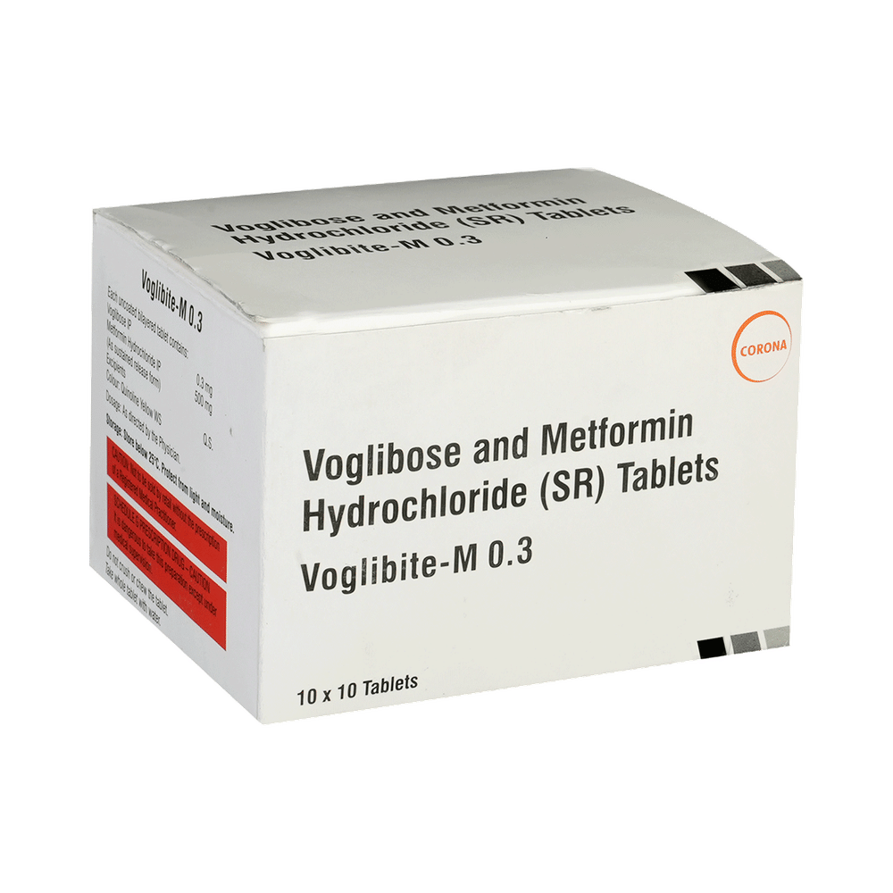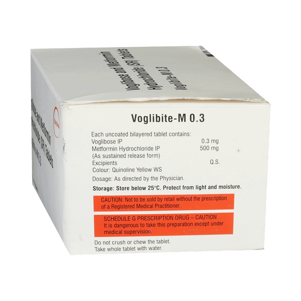 Voglibite-M 0.3 Tablet SR belongs to a category of medicines known as anti-diabetic drugs. It is a combination of medicines used to treat type 2 diabetes mellitus in adults. It helps control blood sugar levels in people with diabetes. Voglibite-M 0.3 Tablet SR should be taken with food. Take it regularly at the same time each day to get the most benefit. Your doctor will decide what dose is best for you and this may change from time to time according to how it is working according to your blood sugar levels.Keep taking this medicine, even if you feel well or your blood sugar levels are controlled. If you stop it without consulting your doctor, your blood sugar levels could rise and put you at risk of kidney damage, blindness, nerve problems and loss of limbs. Remember that it is only part of a treatment program that should also include a healthy diet, regular exercise, and weight reduction as advised by your doctor. Your lifestyle plays a big part in controlling diabetes.This medicine may cause side effects like nausea, taste change, loss of appetite, flatulence, stomach pain, diarrhea, and skin rash. However, these are temporary and usually subside on their own. If these do not resolve or worry you, please consult your doctor. Your doctor might suggest ways of dealing with your side effects or treating them if they are bothersome.You should not take it if you have type 1 diabetes mellitus, if you have diabetic ketoacidosis (high levels of acid in your blood), or if you have severe kidney or liver disease. Before taking this medicine, tell your doctor if you have ever had heart disease. It may not be suitable. Pregnant or breastfeeding women should also consult their doctor before taking it. Your blood sugar levels should be checked regularly and your doctor may also advise blood tests to monitor your blood cell counts and liver function.