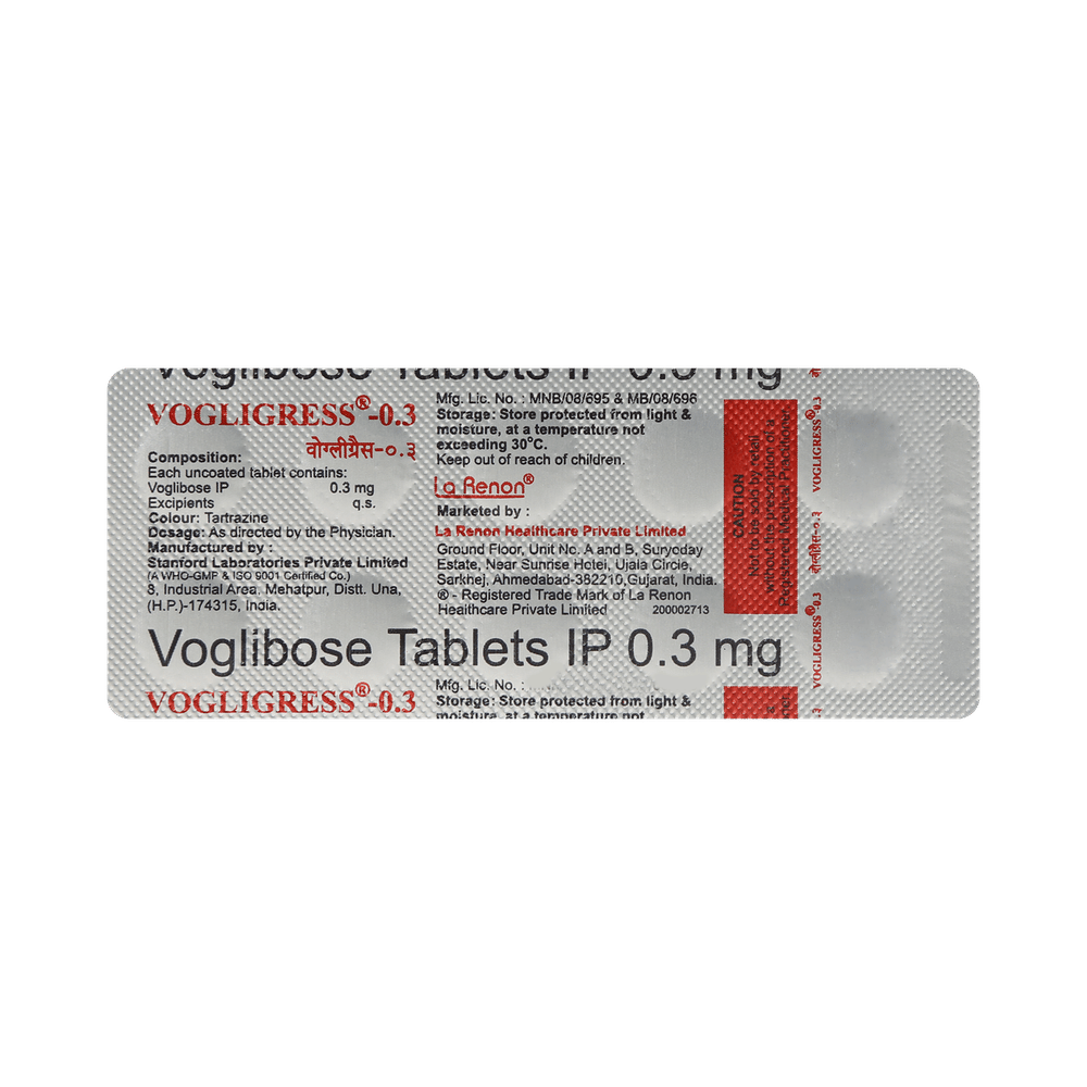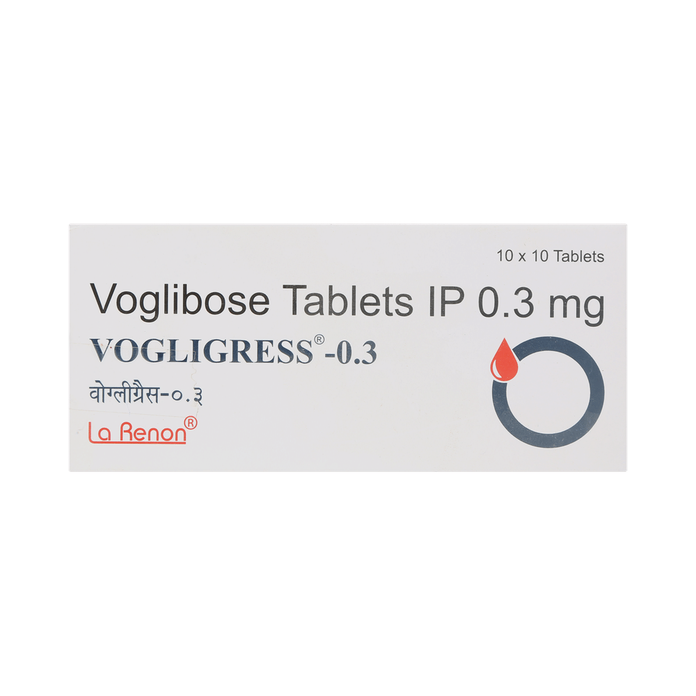 Vogligress 0.3mg Tablet is a medicine used to treat type 2 diabetes mellitus. It helps control the high blood sugar levels in your body after each meal. It is used when other similar medicines along with a restricted diet, are unable to control abnormally high blood sugar levels. Vogligress 0.3mg Tablet should be taken just before a meal. The dose and how often you need it will be decided by your doctor so that you get the right amount to control your blood sugar levels. Do not stop taking it suddenly without consulting your doctor. If you do, your blood sugar levels may increase and put you at risk of serious complications like kidney damage and blindness.This medicine is only part of a treatment program that should also include a healthy diet, regular exercise, and weight reduction as advised by your doctor. Monitor your blood sugar levels regularly while taking this medicine.The most common side effects of Vogligress 0.3mg Tablet include flatulence (gas), stomach pain, loss of appetite, constipation, and diarrhea. Consult your doctor if any of these side effects bother you or do not go away. This medicine by itself does not cause hypoglycemia (low blood sugar levels). However, when used in combination with other diabetes medicines (especially insulin or sulphonylureas), it can lead to hypoglycemia (low blood sugar levels). Such episodes of hypoglycemia will have to be treated by taking plain glucose. Table sugar or common sugar will not help correct low blood sugar levels if you are taking this medicine.Before taking it, let your doctor know if you have any kidney or liver problems. Do not take this medicine if you have ulceration or inflammation in the bowel (eg. ulcerative colitis or Crohn’s disease). Pregnant or breastfeeding women should also consult their doctor before taking it. Please tell your doctor about all the other medicines you are taking to make sure you are safe. Avoid excessive alcohol intake while taking this medicine as it may increase the risk of hypoglycemia (low blood sugar levels).