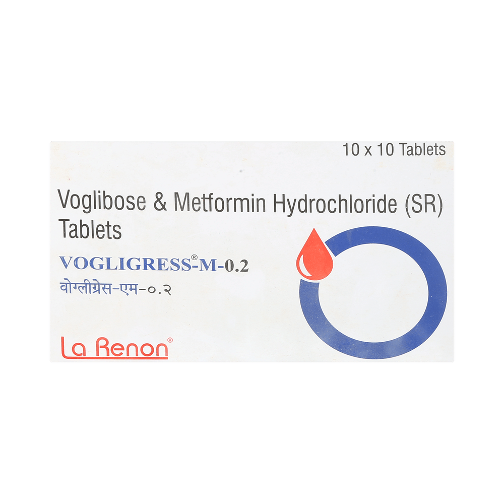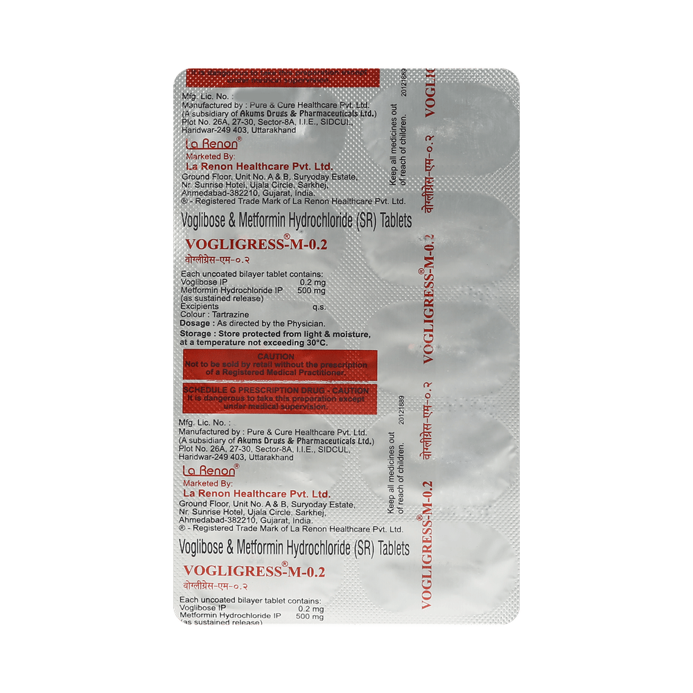 Vogligress-M 0.2 Tablet SR belongs to a category of medicines known as anti-diabetic drugs. It is a combination of medicines used to treat type 2 diabetes mellitus in adults. It helps control blood sugar levels in people with diabetes. Vogligress-M 0.2 Tablet SR should be taken with food. Take it regularly at the same time each day to get the most benefit. Your doctor will decide what dose is best for you and this may change from time to time according to how it is working according to your blood sugar levels.Keep taking this medicine, even if you feel well or your blood sugar levels are controlled. If you stop it without consulting your doctor, your blood sugar levels could rise and put you at risk of kidney damage, blindness, nerve problems and loss of limbs. Remember that it is only part of a treatment program that should also include a healthy diet, regular exercise, and weight reduction as advised by your doctor. Your lifestyle plays a big part in controlling diabetes.This medicine may cause side effects like nausea, taste change, loss of appetite, flatulence, stomach pain, diarrhea, and skin rash. However, these are temporary and usually subside on their own. If these do not resolve or worry you, please consult your doctor. Your doctor might suggest ways of dealing with your side effects or treating them if they are bothersome.You should not take it if you have type 1 diabetes mellitus, if you have diabetic ketoacidosis (high levels of acid in your blood), or if you have severe kidney or liver disease. Before taking this medicine, tell your doctor if you have ever had heart disease. It may not be suitable. Pregnant or breastfeeding women should also consult their doctor before taking it. Your blood sugar levels should be checked regularly and your doctor may also advise blood tests to monitor your blood cell counts and liver function.
