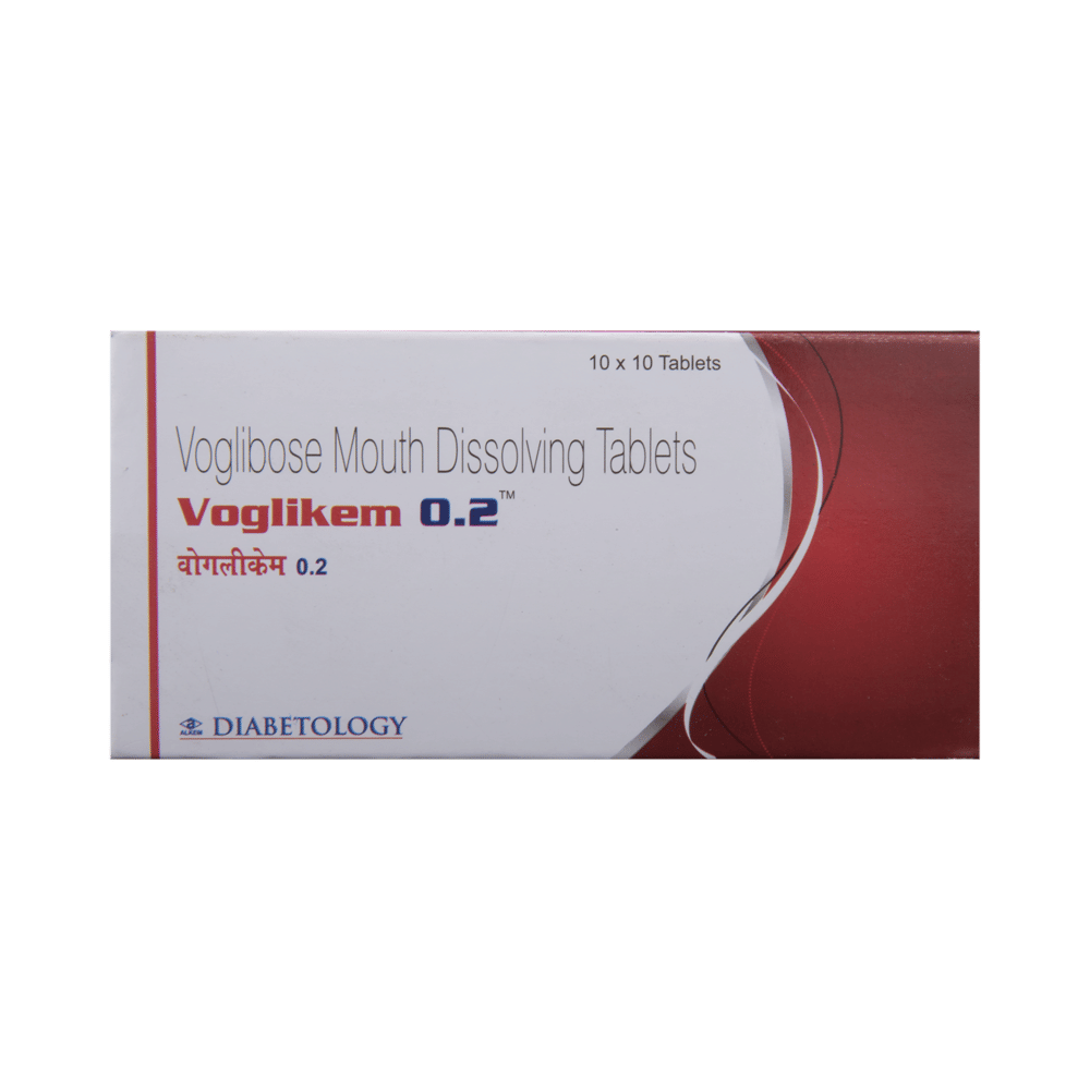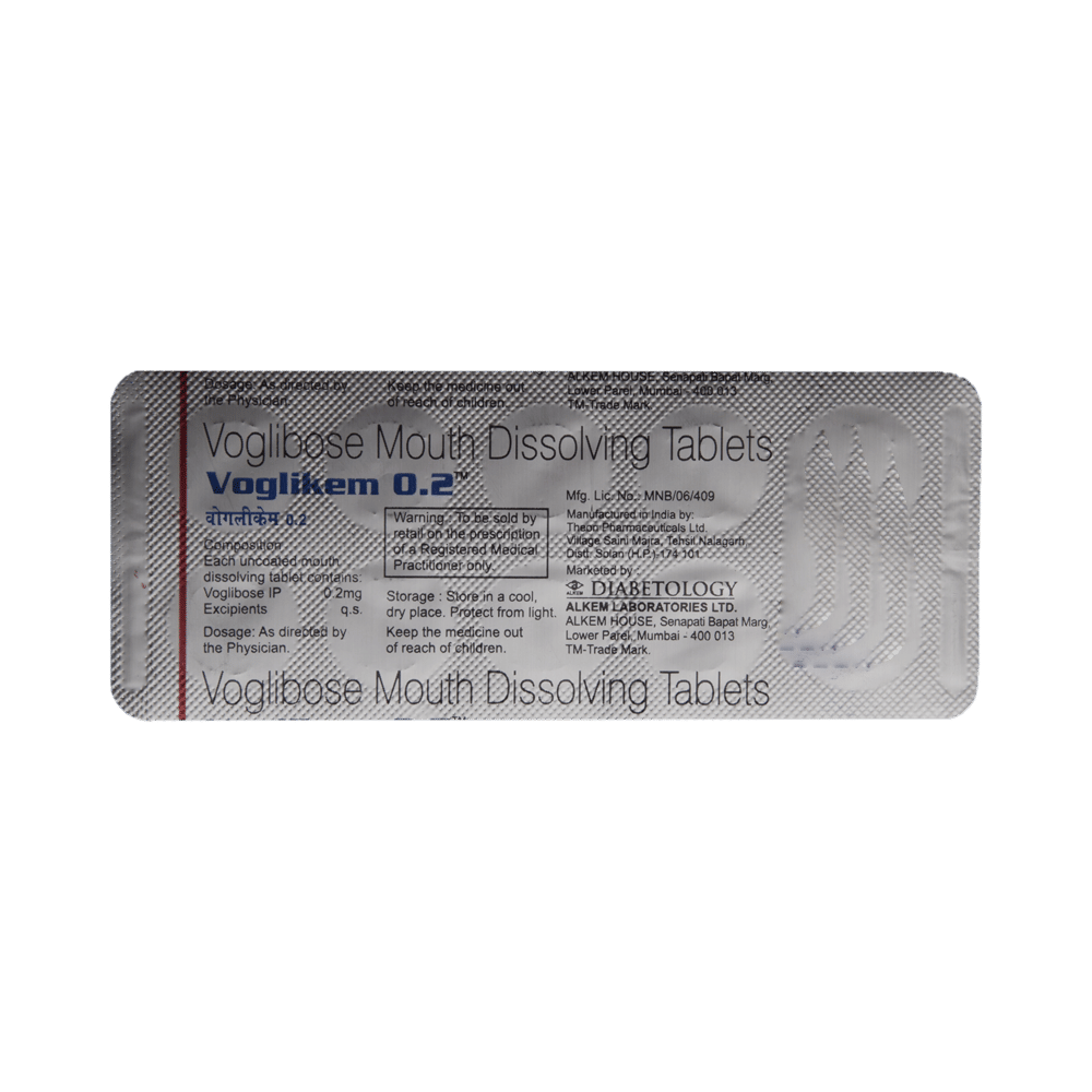 VogliKEM 0.2 Tablet MD is a medicine used to treat type 2 diabetes mellitus. It helps control the high blood sugar levels in your body after each meal. It is used when other similar medicines along with a restricted diet, are unable to control abnormally high blood sugar levels. VogliKEM 0.2 Tablet MD should be taken just before a meal. The dose and how often you need it will be decided by your doctor so that you get the right amount to control your blood sugar levels. Do not stop taking it suddenly without consulting your doctor. If you do, your blood sugar levels may increase and put you at risk of serious complications like kidney damage and blindness.This medicine is only part of a treatment program that should also include a healthy diet, regular exercise, and weight reduction as advised by your doctor. Monitor your blood sugar levels regularly while taking this medicine.The most common side effects of VogliKEM 0.2 Tablet MD include flatulence (gas), stomach pain, loss of appetite, constipation, and diarrhea. Consult your doctor if any of these side effects bother you or do not go away. This medicine by itself does not cause hypoglycemia (low blood sugar levels). However, when used in combination with other diabetes medicines (especially insulin or sulphonylureas), it can lead to hypoglycemia (low blood sugar levels). Such episodes of hypoglycemia will have to be treated by taking plain glucose. Table sugar or common sugar will not help correct low blood sugar levels if you are taking this medicine.Before taking it, let your doctor know if you have any kidney or liver problems. Do not take this medicine if you have ulceration or inflammation in the bowel (eg. ulcerative colitis or Crohn’s disease). Pregnant or breastfeeding women should also consult their doctor before taking it. Please tell your doctor about all the other medicines you are taking to make sure you are safe. Avoid excessive alcohol intake while taking this medicine as it may increase the risk of hypoglycemia (low blood sugar levels).