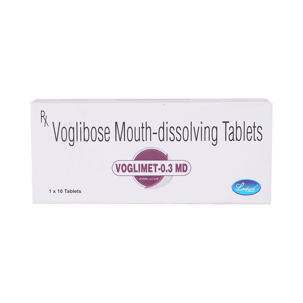 Voglimet 0.3mg Tablet MD is a medicine used to treat type 2 diabetes mellitus. It helps control the high blood sugar levels in your body after each meal. It is used when other similar medicines along with a restricted diet, are unable to control abnormally high blood sugar levels. Voglimet 0.3mg Tablet MD should be taken just before a meal. The dose and how often you need it will be decided by your doctor so that you get the right amount to control your blood sugar levels. Do not stop taking it suddenly without consulting your doctor. If you do, your blood sugar levels may increase and put you at risk of serious complications like kidney damage and blindness.This medicine is only part of a treatment program that should also include a healthy diet, regular exercise, and weight reduction as advised by your doctor. Monitor your blood sugar levels regularly while taking this medicine.The most common side effects of Voglimet 0.3mg Tablet MD include flatulence (gas), stomach pain, loss of appetite, constipation, and diarrhea. Consult your doctor if any of these side effects bother you or do not go away. This medicine by itself does not cause hypoglycemia (low blood sugar levels). However, when used in combination with other diabetes medicines (especially insulin or sulphonylureas), it can lead to hypoglycemia (low blood sugar levels). Such episodes of hypoglycemia will have to be treated by taking plain glucose. Table sugar or common sugar will not help correct low blood sugar levels if you are taking this medicine.Before taking it, let your doctor know if you have any kidney or liver problems. Do not take this medicine if you have ulceration or inflammation in the bowel (eg. ulcerative colitis or Crohn’s disease). Pregnant or breastfeeding women should also consult their doctor before taking it. Please tell your doctor about all the other medicines you are taking to make sure you are safe. Avoid excessive alcohol intake while taking this medicine as it may increase the risk of hypoglycemia (low blood sugar levels).