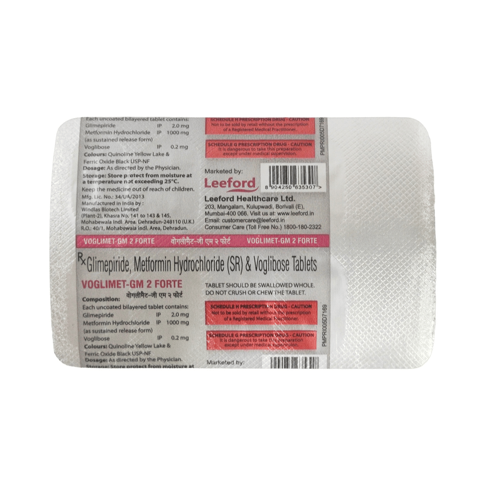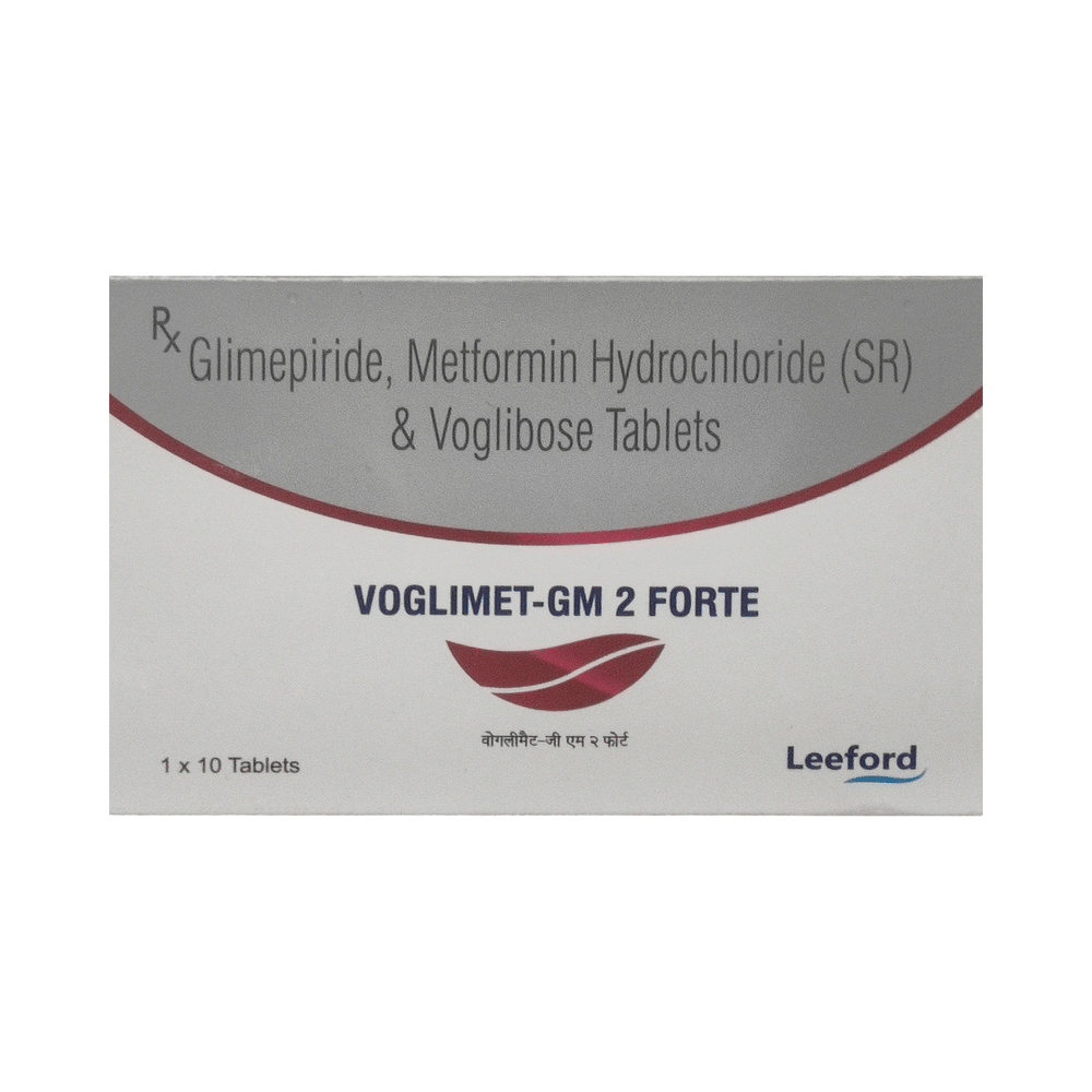 Voglimet-GM 2 Forte Tablet SR belongs to a category of medicines known as anti-diabetic drugs. It is a combination of medicines used to treat type 2 diabetes mellitus in adults. It helps control blood sugar levels in people with diabetes. Take Voglimet-GM 2 Forte Tablet SR with or immediately before meals. Take it regularly at the same time each day to get the most benefit. Your doctor will decide what dose is best for you, and this may change from time to time depending on how it is working according to your blood sugar levels.Keep taking this medicine, even if you feel well or your blood sugar levels are controlled. If you stop it without consulting your doctor, your blood sugar levels could rise and put you at risk of kidney damage, blindness, nerve problems, and loss of limbs. Remember that it is only part of a treatment program that should also include a healthy diet, regular exercise, and weight reduction as advised by your doctor. Your lifestyle plays a big part in controlling diabetes.Common side effects of Voglimet-GM 2 Forte Tablet SR are nausea, vomiting, abdominal pain, and loss of appetite. Make sure you recognize the signs of low blood glucose levels, such as sweating, dizziness, headache, and shaking, and know how to deal with them. To prevent this, it's important to have regular meals and always carry a fast-acting source of glucose, such as sugary food or fruit juice, with you.Drinking alcohol can also increase your risk of low blood sugar levels and should be avoided. Other side effects that may be seen on taking this medicine include taste changes, nausea, diarrhea, stomach pain, headache, edema (swelling), blurred vision, bone fracture, and upper respiratory tract infection. Some people may find that they put on weight with this medicine.You should not take Voglimet-GM 2 Forte Tablet SR if you have type 1 diabetes mellitus, if you have diabetic ketoacidosis (high levels of acid in your blood), or if you have severe kidney or liver disease. Before taking this medicine, tell your doctor if you have ever had heart disease, as it may not be suitable. Pregnant or breastfeeding women should also consult their doctor before taking it. Your blood sugar levels should be checked regularly, and your doctor may also advise blood tests to monitor your blood cell counts and liver function.