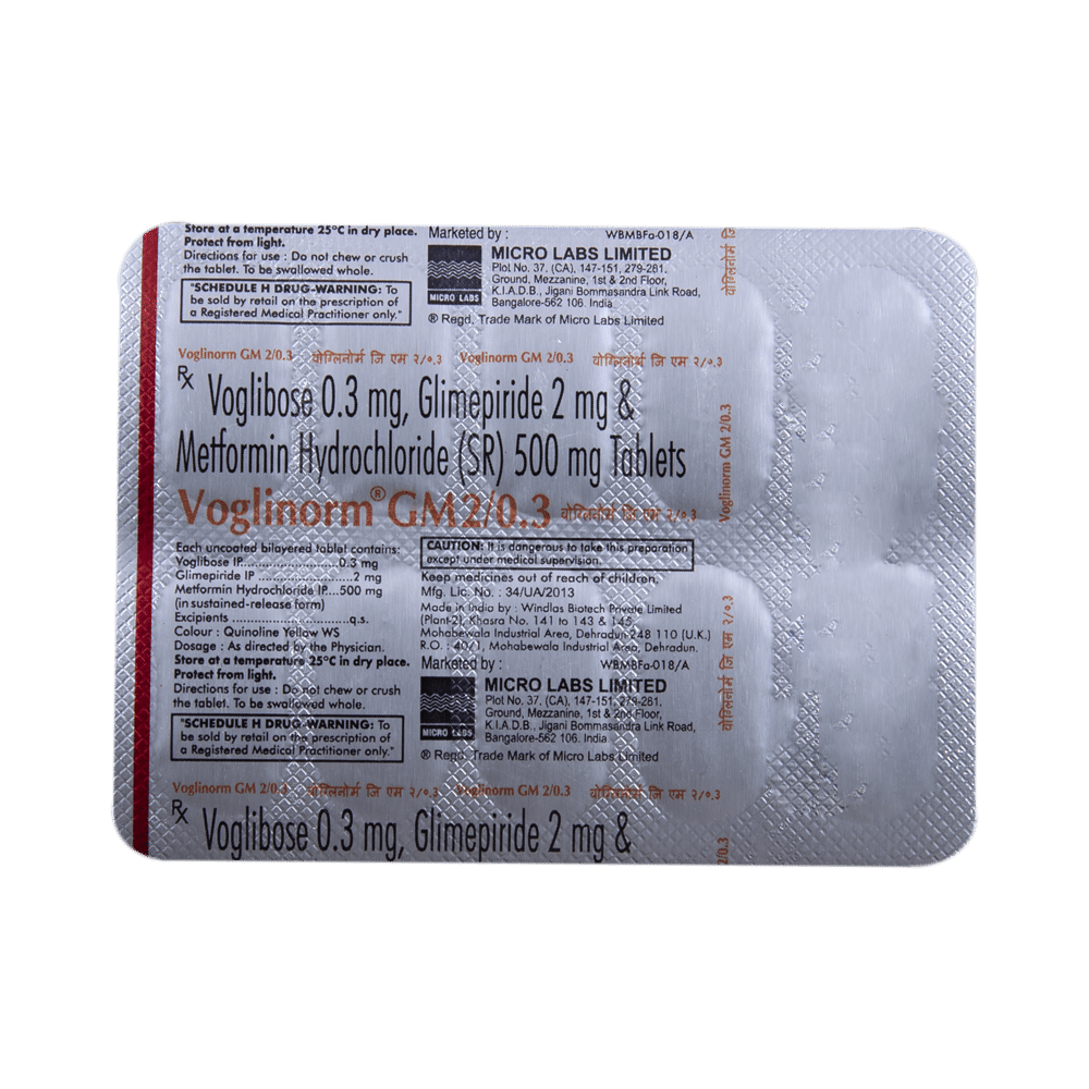 Voglinorm GM 2/0.3 Tablet SR belongs to a category of medicines known as anti-diabetic drugs. It is a combination of medicines used to treat type 2 diabetes mellitus in adults. It helps control blood sugar levels in people with diabetes. Take Voglinorm GM 2/0.3 Tablet SR with or immediately before meals. Take it regularly at the same time each day to get the most benefit. Your doctor will decide what dose is best for you, and this may change from time to time depending on how it is working according to your blood sugar levels.Keep taking this medicine, even if you feel well or your blood sugar levels are controlled. If you stop it without consulting your doctor, your blood sugar levels could rise and put you at risk of kidney damage, blindness, nerve problems, and loss of limbs. Remember that it is only part of a treatment program that should also include a healthy diet, regular exercise, and weight reduction as advised by your doctor. Your lifestyle plays a big part in controlling diabetes.Common side effects of Voglinorm GM 2/0.3 Tablet SR are nausea, vomiting, abdominal pain, and loss of appetite. Make sure you recognize the signs of low blood glucose levels, such as sweating, dizziness, headache, and shaking, and know how to deal with them. To prevent this, it's important to have regular meals and always carry a fast-acting source of glucose, such as sugary food or fruit juice, with you.Drinking alcohol can also increase your risk of low blood sugar levels and should be avoided. Other side effects that may be seen on taking this medicine include taste changes, nausea, diarrhea, stomach pain, headache, edema (swelling), blurred vision, bone fracture, and upper respiratory tract infection. Some people may find that they put on weight with this medicine.You should not take Voglinorm GM 2/0.3 Tablet SR if you have type 1 diabetes mellitus, if you have diabetic ketoacidosis (high levels of acid in your blood), or if you have severe kidney or liver disease. Before taking this medicine, tell your doctor if you have ever had heart disease, as it may not be suitable. Pregnant or breastfeeding women should also consult their doctor before taking it. Your blood sugar levels should be checked regularly, and your doctor may also advise blood tests to monitor your blood cell counts and liver function.