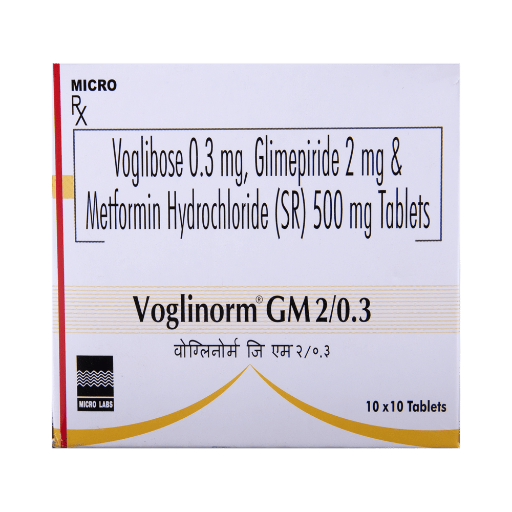 Voglinorm GM 2/0.3 Tablet SR is a combination of three antidiabetic medicines: glimepiride, metformin, and voglibose. They work by different mechanisms to provide better control of blood sugar when single or dual therapy is not effective. Glimepiride is a sulfonylurea that works by increasing the amount of insulin released by the pancreas to lower the blood glucose. Metformin is a biguanide that lowers glucose production in the liver, delays glucose absorption from the intestines, and increases the body's sensitivity to insulin. Voglibose is an alpha-glucosidase inhibitor that prevents the breakdown of complex sugars into simple sugars such as glucose. This prevents the blood glucose levels from rising to very high levels after meals.