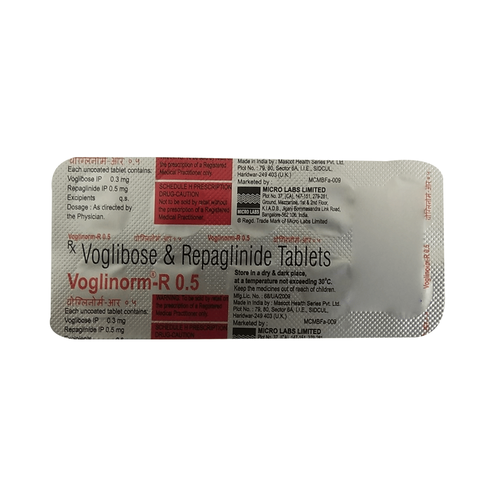 Voglinorm-R Tablet is a combination of two medicines used to treat type 2 diabetes mellitus. It helps control the high blood sugar levels in your body after each meal. It is used when other similar medicines along with a restricted diet, are unable to control abnormally high blood sugar levels. Voglinorm-R Tablet should be taken just after meals. The dose will be decided by your doctor. Do not stop taking it without asking your doctor. If you do, your blood sugar levels may increase and put you at risk of serious complications like kidney damage and blindness. If you miss a dose, do not take the missed dose between two meals. Wait until your next meal and take it just after meals as usual. Do not take a double dose to make up for the missed dose. This medicine is only part of a treatment program that should include a healthy diet, regular exercise, and weight reduction as advised by your doctor.The most common side effects of this medicine include flatulence, diarrhea, stomach pain, hypoglycemia (low blood sugar level), and skin rash. However, these are temporary and usually resolve on their own. Please consult your doctor if these do not resolve or persist for a longer duration. Monitor your blood sugar levels regularly while taking this medicine.Before taking this medicine, inform your doctor if you have any kidney or liver problems or urinary tract infection or if you are on water pills (diuretics). Pregnant or breastfeeding women should also consult their doctor before taking it. Avoid excessive alcohol intake while taking it as this may increase the risk of developing some side effects.