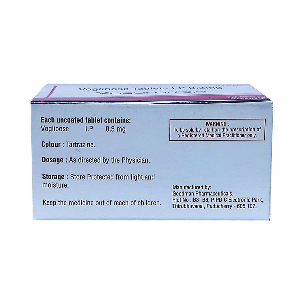 Vogliron 0.3mg Tablet MD is a medicine used to treat type 2 diabetes mellitus. It helps control the high blood sugar levels in your body after each meal. It is used when other similar medicines along with a restricted diet, are unable to control abnormally high blood sugar levels. Vogliron 0.3mg Tablet MD should be taken just before a meal. The dose and how often you need it will be decided by your doctor so that you get the right amount to control your blood sugar levels. Do not stop taking it suddenly without consulting your doctor. If you do, your blood sugar levels may increase and put you at risk of serious complications like kidney damage and blindness.This medicine is only part of a treatment program that should also include a healthy diet, regular exercise, and weight reduction as advised by your doctor. Monitor your blood sugar levels regularly while taking this medicine.The most common side effects of Vogliron 0.3mg Tablet MD include flatulence (gas), stomach pain, loss of appetite, constipation, and diarrhea. Consult your doctor if any of these side effects bother you or do not go away. This medicine by itself does not cause hypoglycemia (low blood sugar levels). However, when used in combination with other diabetes medicines (especially insulin or sulphonylureas), it can lead to hypoglycemia (low blood sugar levels). Such episodes of hypoglycemia will have to be treated by taking plain glucose. Table sugar or common sugar will not help correct low blood sugar levels if you are taking this medicine.Before taking it, let your doctor know if you have any kidney or liver problems. Do not take this medicine if you have ulceration or inflammation in the bowel (eg. ulcerative colitis or Crohn’s disease). Pregnant or breastfeeding women should also consult their doctor before taking it. Please tell your doctor about all the other medicines you are taking to make sure you are safe. Avoid excessive alcohol intake while taking this medicine as it may increase the risk of hypoglycemia (low blood sugar levels).