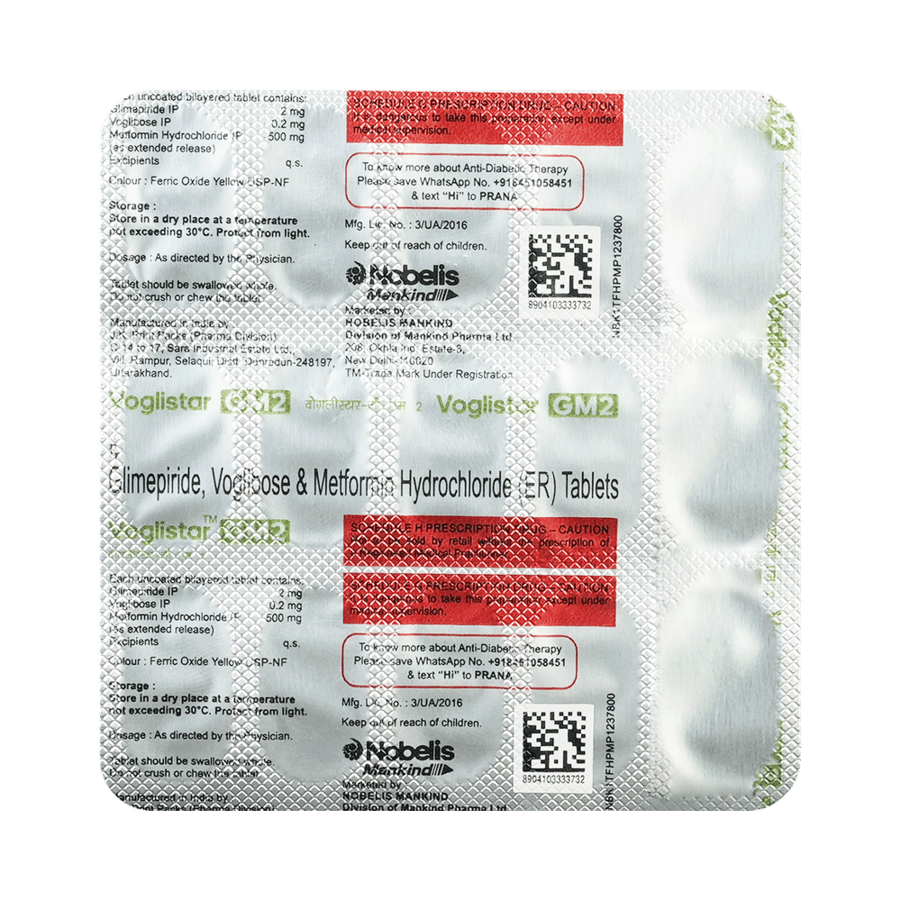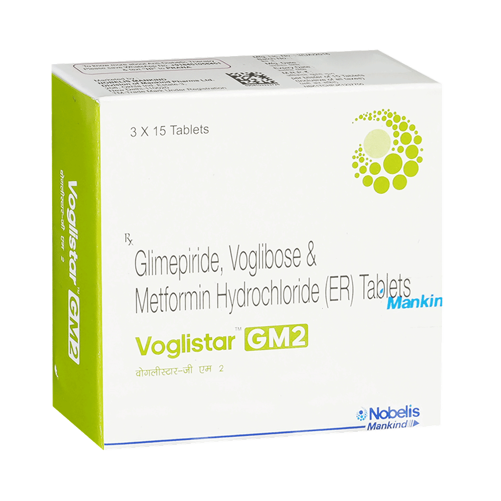 Voglistar GM2 Tablet ER is a combination of three antidiabetic medicines: glimepiride, metformin, and voglibose. They work by different mechanisms to provide better control of blood sugar when single or dual therapy is not effective. Glimepiride is a sulfonylurea that works by increasing the amount of insulin released by the pancreas to lower the blood glucose. Metformin is a biguanide that lowers glucose production in the liver, delays glucose absorption from the intestines, and increases the body's sensitivity to insulin. Voglibose is an alpha-glucosidase inhibitor that prevents the breakdown of complex sugars into simple sugars such as glucose. This prevents the blood glucose levels from rising to very high levels after meals.