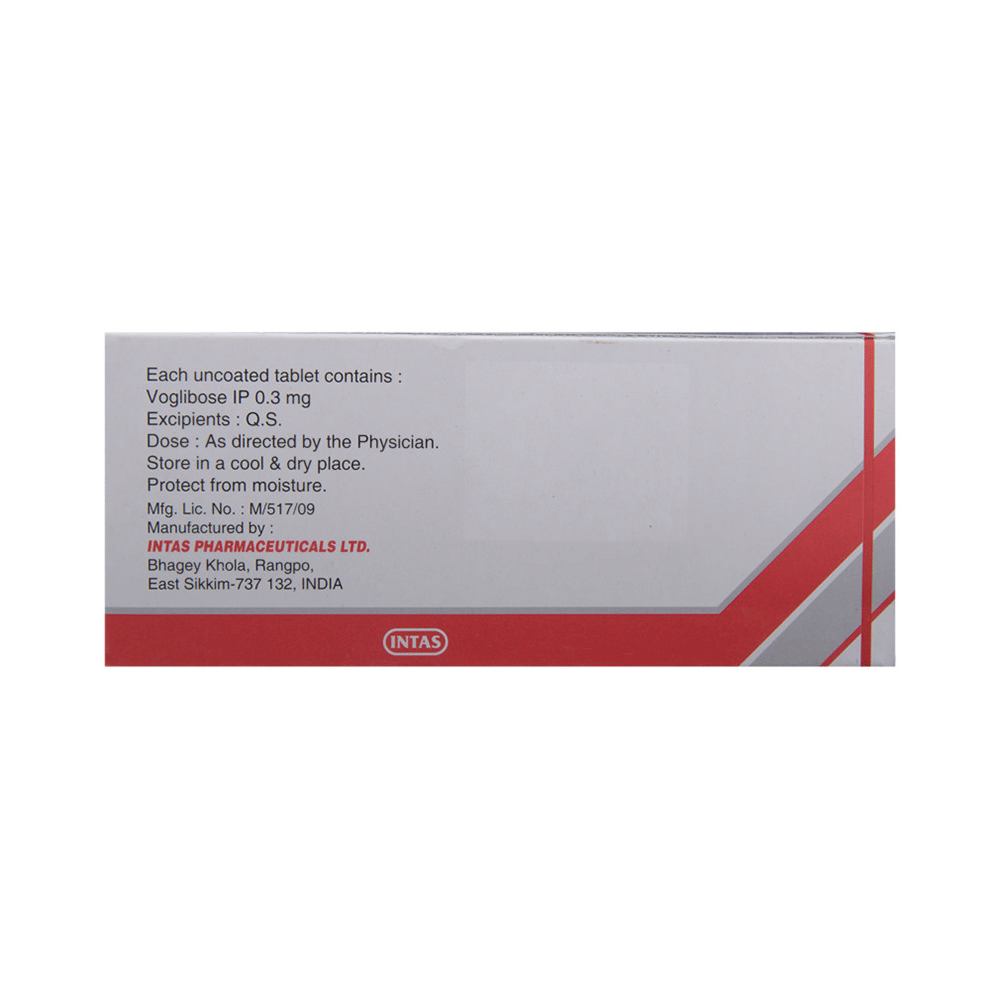 Voglitab 0.3 Tablet is a medicine used to treat type 2 diabetes mellitus. It helps control the high blood sugar levels in your body after each meal. It is used when other similar medicines along with a restricted diet, are unable to control abnormally high blood sugar levels. Voglitab 0.3 Tablet should be taken just before a meal. The dose and how often you need it will be decided by your doctor so that you get the right amount to control your blood sugar levels. Do not stop taking it suddenly without consulting your doctor. If you do, your blood sugar levels may increase and put you at risk of serious complications like kidney damage and blindness.This medicine is only part of a treatment program that should also include a healthy diet, regular exercise, and weight reduction as advised by your doctor. Monitor your blood sugar levels regularly while taking this medicine.The most common side effects of Voglitab 0.3 Tablet include flatulence (gas), stomach pain, loss of appetite, constipation, and diarrhea. Consult your doctor if any of these side effects bother you or do not go away. This medicine by itself does not cause hypoglycemia (low blood sugar levels). However, when used in combination with other diabetes medicines (especially insulin or sulphonylureas), it can lead to hypoglycemia (low blood sugar levels). Such episodes of hypoglycemia will have to be treated by taking plain glucose. Table sugar or common sugar will not help correct low blood sugar levels if you are taking this medicine.Before taking it, let your doctor know if you have any kidney or liver problems. Do not take this medicine if you have ulceration or inflammation in the bowel (eg. ulcerative colitis or Crohn’s disease). Pregnant or breastfeeding women should also consult their doctor before taking it. Please tell your doctor about all the other medicines you are taking to make sure you are safe. Avoid excessive alcohol intake while taking this medicine as it may increase the risk of hypoglycemia (low blood sugar levels).