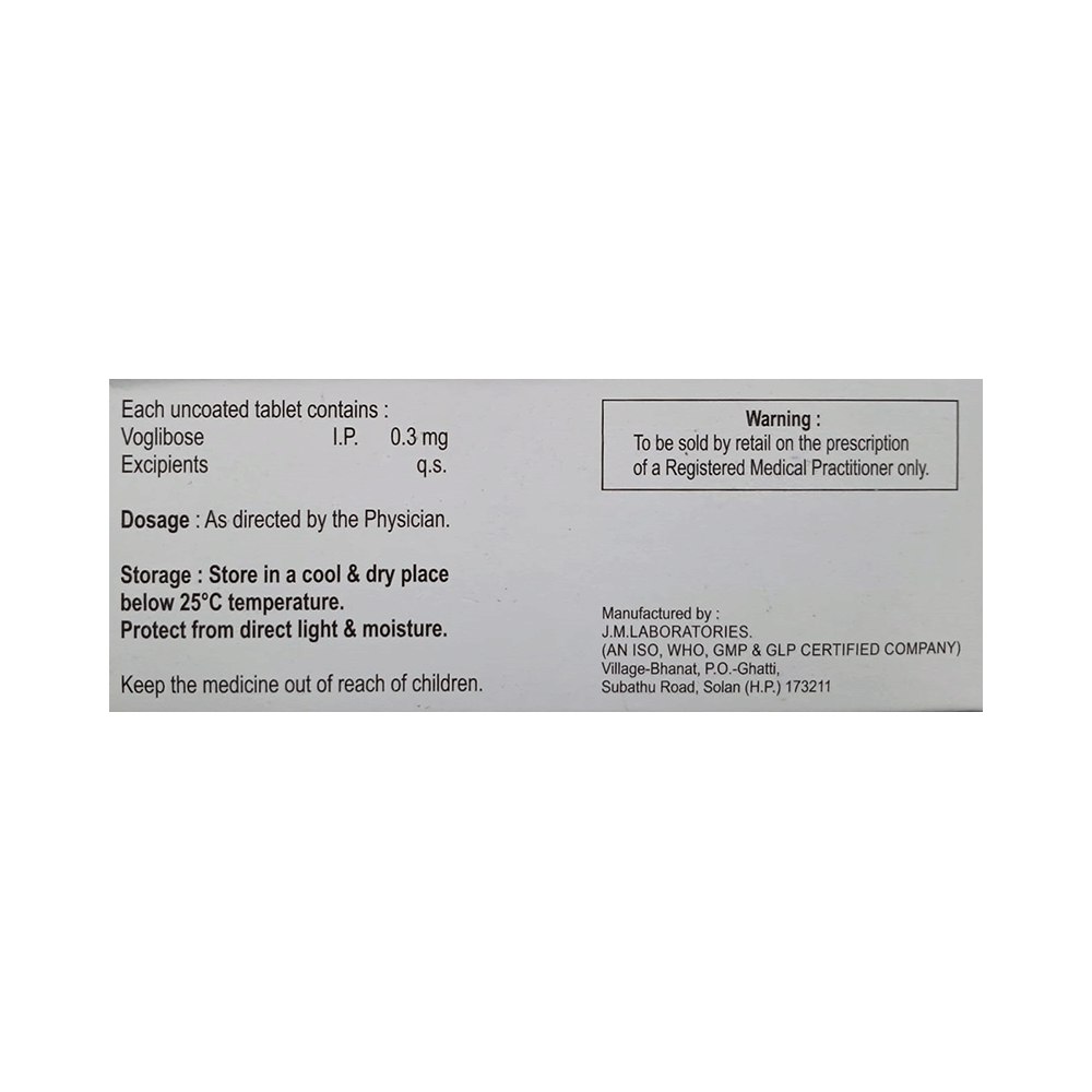 Voglizox 0.3 Tablet is a medicine used to treat type 2 diabetes mellitus. It helps control the high blood sugar levels in your body after each meal. It is used when other similar medicines along with a restricted diet, are unable to control abnormally high blood sugar levels. Voglizox 0.3 Tablet should be taken just before a meal. The dose and how often you need it will be decided by your doctor so that you get the right amount to control your blood sugar levels. Do not stop taking it suddenly without consulting your doctor. If you do, your blood sugar levels may increase and put you at risk of serious complications like kidney damage and blindness.This medicine is only part of a treatment program that should also include a healthy diet, regular exercise, and weight reduction as advised by your doctor. Monitor your blood sugar levels regularly while taking this medicine.The most common side effects of Voglizox 0.3 Tablet include flatulence (gas), stomach pain, loss of appetite, constipation, and diarrhea. Consult your doctor if any of these side effects bother you or do not go away. This medicine by itself does not cause hypoglycemia (low blood sugar levels). However, when used in combination with other diabetes medicines (especially insulin or sulphonylureas), it can lead to hypoglycemia (low blood sugar levels). Such episodes of hypoglycemia will have to be treated by taking plain glucose. Table sugar or common sugar will not help correct low blood sugar levels if you are taking this medicine.Before taking it, let your doctor know if you have any kidney or liver problems. Do not take this medicine if you have ulceration or inflammation in the bowel (eg. ulcerative colitis or Crohn’s disease). Pregnant or breastfeeding women should also consult their doctor before taking it. Please tell your doctor about all the other medicines you are taking to make sure you are safe. Avoid excessive alcohol intake while taking this medicine as it may increase the risk of hypoglycemia (low blood sugar levels).