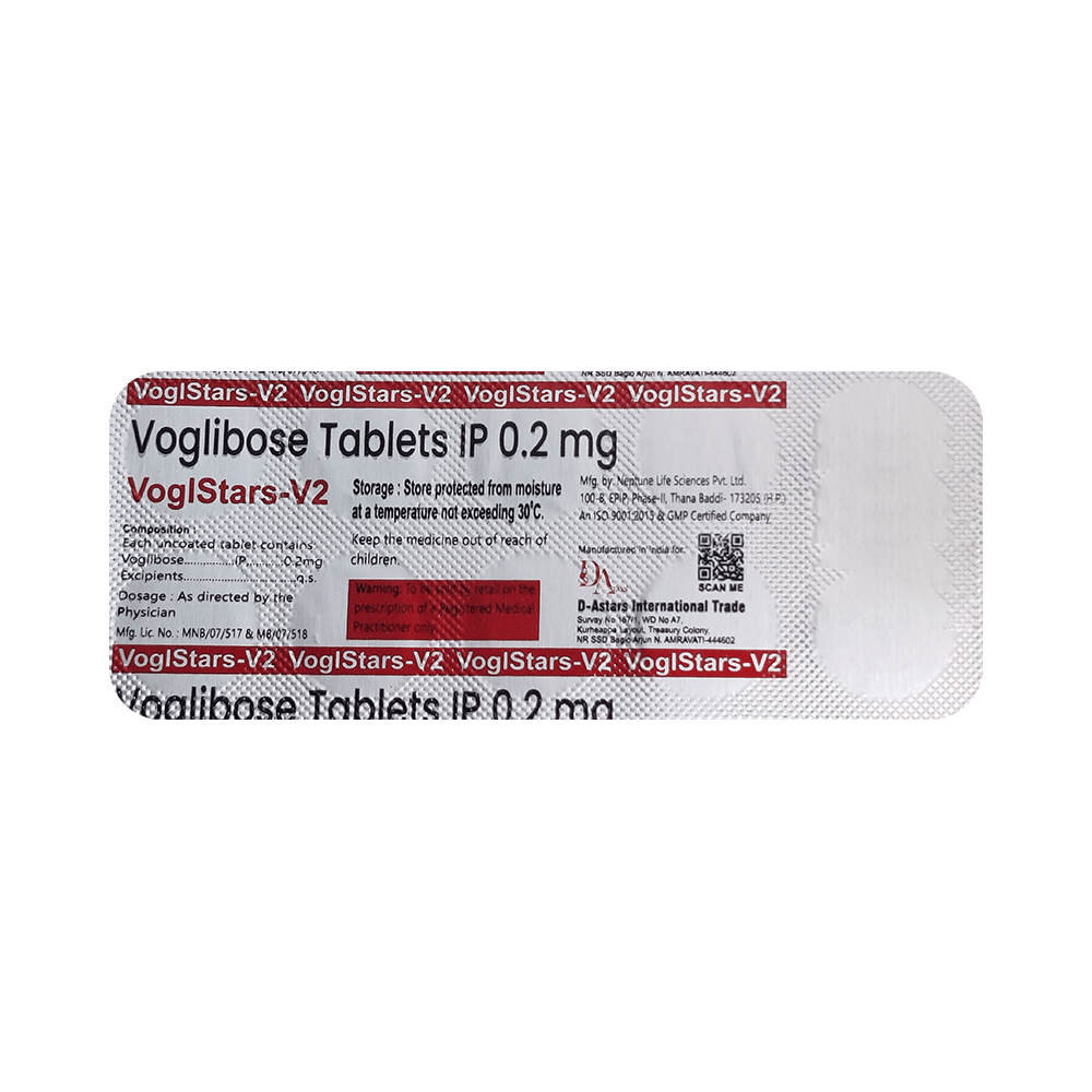 VoglStars-V2 Tablet is a medicine used to treat type 2 diabetes mellitus. It helps control the high blood sugar levels in your body after each meal. It is used when other similar medicines along with a restricted diet, are unable to control abnormally high blood sugar levels. VoglStars-V2 Tablet should be taken just before a meal. The dose and how often you need it will be decided by your doctor so that you get the right amount to control your blood sugar levels. Do not stop taking it suddenly without consulting your doctor. If you do, your blood sugar levels may increase and put you at risk of serious complications like kidney damage and blindness.This medicine is only part of a treatment program that should also include a healthy diet, regular exercise, and weight reduction as advised by your doctor. Monitor your blood sugar levels regularly while taking this medicine.The most common side effects of VoglStars-V2 Tablet include flatulence (gas), stomach pain, loss of appetite, constipation, and diarrhea. Consult your doctor if any of these side effects bother you or do not go away. This medicine by itself does not cause hypoglycemia (low blood sugar levels). However, when used in combination with other diabetes medicines (especially insulin or sulphonylureas), it can lead to hypoglycemia (low blood sugar levels). Such episodes of hypoglycemia will have to be treated by taking plain glucose. Table sugar or common sugar will not help correct low blood sugar levels if you are taking this medicine.Before taking it, let your doctor know if you have any kidney or liver problems. Do not take this medicine if you have ulceration or inflammation in the bowel (eg. ulcerative colitis or Crohn’s disease). Pregnant or breastfeeding women should also consult their doctor before taking it. Please tell your doctor about all the other medicines you are taking to make sure you are safe. Avoid excessive alcohol intake while taking this medicine as it may increase the risk of hypoglycemia (low blood sugar levels).