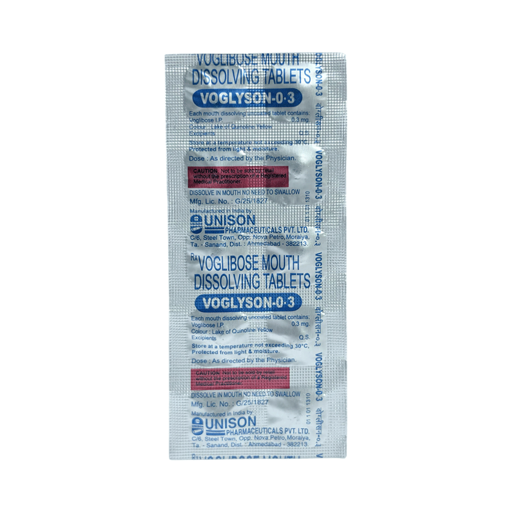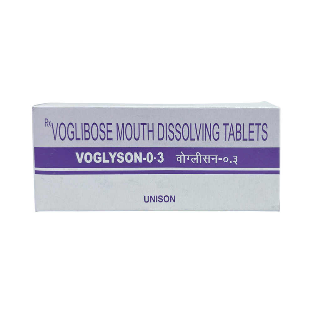 Voglyson 0.3 Tablet MD is a medicine used to treat type 2 diabetes mellitus. It helps control the high blood sugar levels in your body after each meal. It is used when other similar medicines along with a restricted diet, are unable to control abnormally high blood sugar levels. Voglyson 0.3 Tablet MD should be taken just before a meal. The dose and how often you need it will be decided by your doctor so that you get the right amount to control your blood sugar levels. Do not stop taking it suddenly without consulting your doctor. If you do, your blood sugar levels may increase and put you at risk of serious complications like kidney damage and blindness.This medicine is only part of a treatment program that should also include a healthy diet, regular exercise, and weight reduction as advised by your doctor. Monitor your blood sugar levels regularly while taking this medicine.The most common side effects of Voglyson 0.3 Tablet MD include flatulence (gas), stomach pain, loss of appetite, constipation, and diarrhea. Consult your doctor if any of these side effects bother you or do not go away. This medicine by itself does not cause hypoglycemia (low blood sugar levels). However, when used in combination with other diabetes medicines (especially insulin or sulphonylureas), it can lead to hypoglycemia (low blood sugar levels). Such episodes of hypoglycemia will have to be treated by taking plain glucose. Table sugar or common sugar will not help correct low blood sugar levels if you are taking this medicine.Before taking it, let your doctor know if you have any kidney or liver problems. Do not take this medicine if you have ulceration or inflammation in the bowel (eg. ulcerative colitis or Crohn’s disease). Pregnant or breastfeeding women should also consult their doctor before taking it. Please tell your doctor about all the other medicines you are taking to make sure you are safe. Avoid excessive alcohol intake while taking this medicine as it may increase the risk of hypoglycemia (low blood sugar levels).