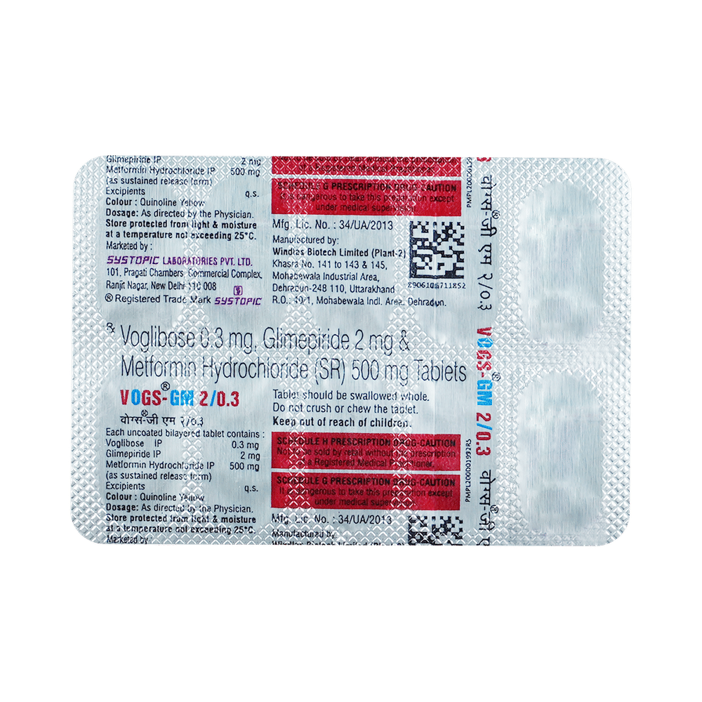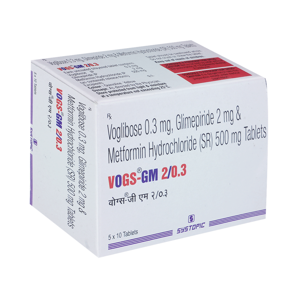 Vogs-GM 2/0.3 Tablet SR is a combination of three antidiabetic medicines: glimepiride, metformin, and voglibose. They work by different mechanisms to provide better control of blood sugar when single or dual therapy is not effective. Glimepiride is a sulfonylurea that works by increasing the amount of insulin released by the pancreas to lower the blood glucose. Metformin is a biguanide that lowers glucose production in the liver, delays glucose absorption from the intestines, and increases the body's sensitivity to insulin. Voglibose is an alpha-glucosidase inhibitor that prevents the breakdown of complex sugars into simple sugars such as glucose. This prevents the blood glucose levels from rising to very high levels after meals.
