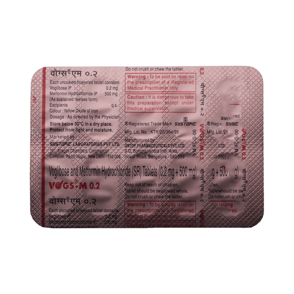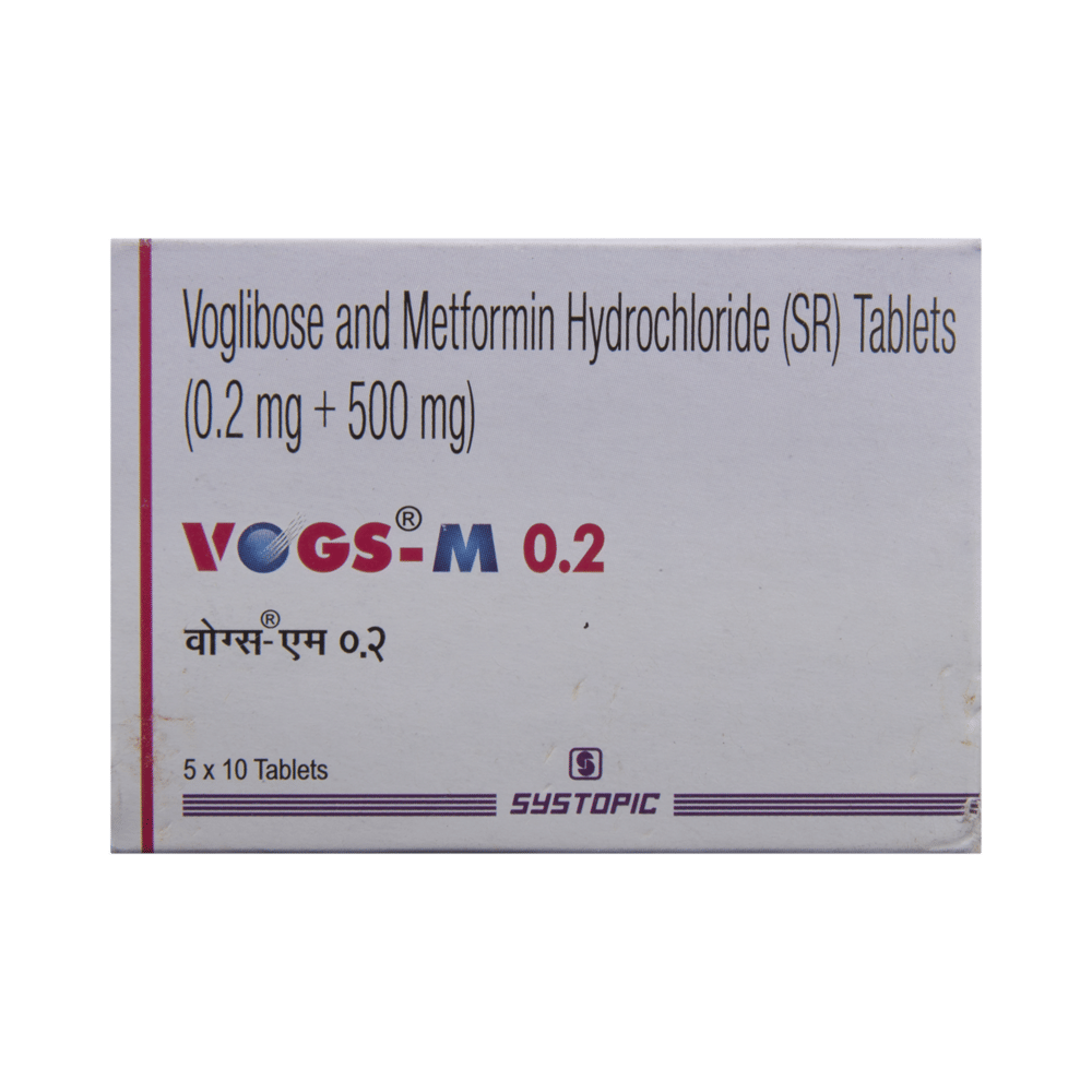 Vogs-M 0.2 Tablet SR belongs to a category of medicines known as anti-diabetic drugs. It is a combination of medicines used to treat type 2 diabetes mellitus in adults. It helps control blood sugar levels in people with diabetes. Vogs-M 0.2 Tablet SR should be taken with food. Take it regularly at the same time each day to get the most benefit. Your doctor will decide what dose is best for you and this may change from time to time according to how it is working according to your blood sugar levels.Keep taking this medicine, even if you feel well or your blood sugar levels are controlled. If you stop it without consulting your doctor, your blood sugar levels could rise and put you at risk of kidney damage, blindness, nerve problems and loss of limbs. Remember that it is only part of a treatment program that should also include a healthy diet, regular exercise, and weight reduction as advised by your doctor. Your lifestyle plays a big part in controlling diabetes.This medicine may cause side effects like nausea, taste change, loss of appetite, flatulence, stomach pain, diarrhea, and skin rash. However, these are temporary and usually subside on their own. If these do not resolve or worry you, please consult your doctor. Your doctor might suggest ways of dealing with your side effects or treating them if they are bothersome.You should not take it if you have type 1 diabetes mellitus, if you have diabetic ketoacidosis (high levels of acid in your blood), or if you have severe kidney or liver disease. Before taking this medicine, tell your doctor if you have ever had heart disease. It may not be suitable. Pregnant or breastfeeding women should also consult their doctor before taking it. Your blood sugar levels should be checked regularly and your doctor may also advise blood tests to monitor your blood cell counts and liver function.