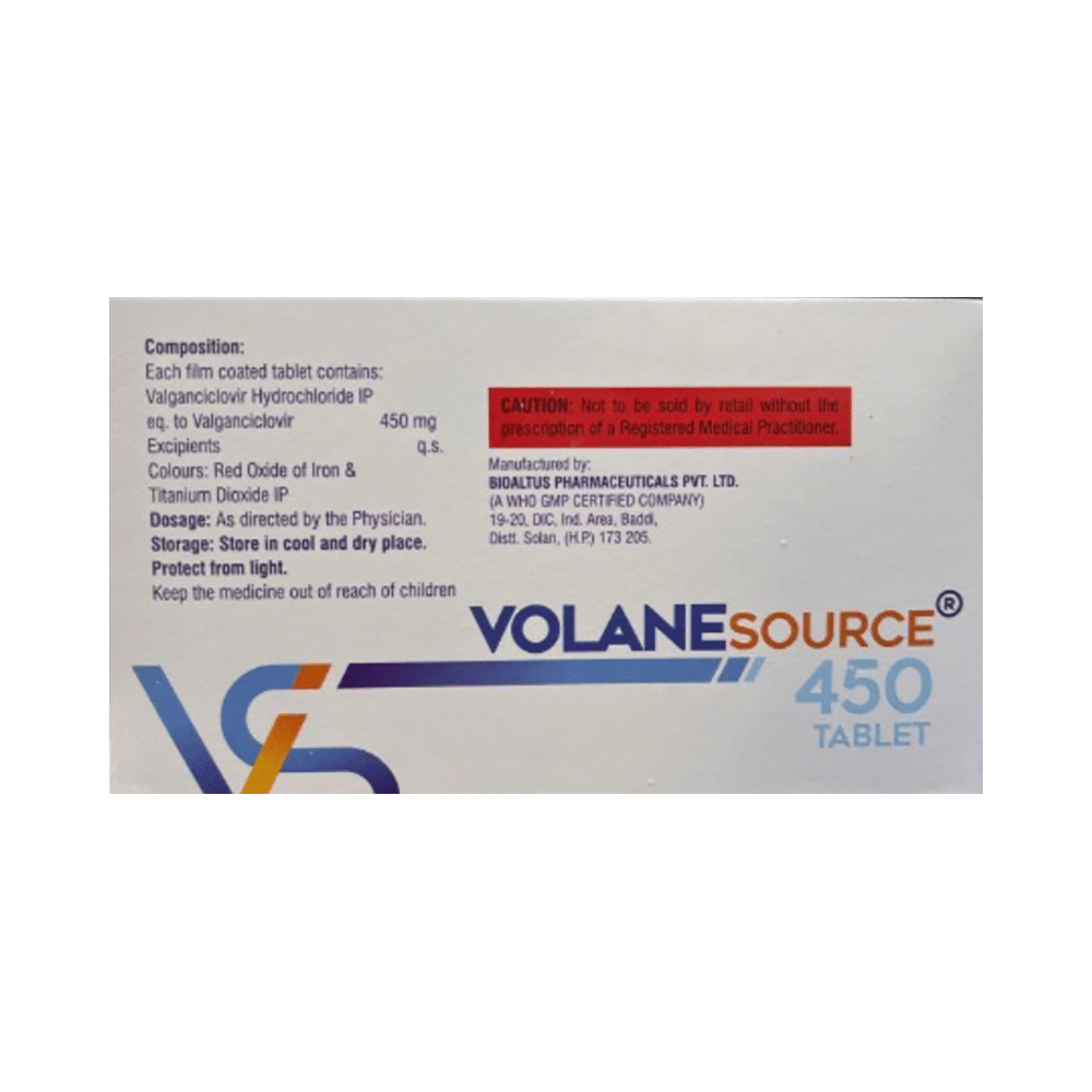 Volane Source 450 Tablet is used to treat cytomegalovirus (CMV) infection of the retina (retinitis) in adult patients with acquired immunodeficiency syndrome (AIDS). It is also used for the prevention of CMV infection in patients who have received an organ transplant from a CMV-infected donor. Volane Source 450 Tablet should be taken in the dose and duration as advised by your doctor. Do not skip any doses and finish the full course of treatment even if you feel better. It should be taken with food. You should drink plenty of water while on treatment with this medicine, as it helps prevent dehydration and kidney damage.Volane Source 450 Tablet may cause a few common side effects like diarrhea, vomiting, anemia, low white blood cells, low platelet levels, insomnia, and vomiting. Inform your doctor if these side effects persist for a longer duration.Before you start Volane Source 450 Tablet, let your doctor know if you have any medical conditions. Let your doctor also know about all the medications you are taking, as some medicines may interact with Volane Source 450 Tablet. Please consult your doctor if you are pregnant, planning to conceive, or breastfeeding.