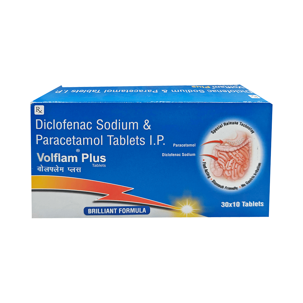 Volflam Plus 50 mg/325 mg Tablet is a pain-relieving medicine. It is used to reduce pain and inflammation in conditions like rheumatoid arthritis, ankylosing spondylitis, and osteoarthritis. It may also be used to relieve muscle pain, back pain, toothache, or pain in the ear and throat. Volflam Plus 50 mg/325 mg Tablet should be taken with food. This will prevent you from getting an upset stomach. You should take it regularly as advised by your doctor. Do not take more or use it for a longer duration than recommended by your doctor.Some of the common side effects of this medicine include nausea, vomiting, stomach pain, loss of appetite, heartburn, and diarrhea. If any of these side effects bother you or do not go away with time, you should let your doctor know. Your doctor may help you with ways to reduce or prevent the side effects.The medicine may not be suitable for everybody. Before taking it, let your doctor know if you have any problems with your heart, kidneys, liver, or have stomach ulcers. To make sure it is safe for you, let your doctor know about all the other medicines you are taking. Pregnant and breastfeeding mothers should first consult their doctors before using this medicine.