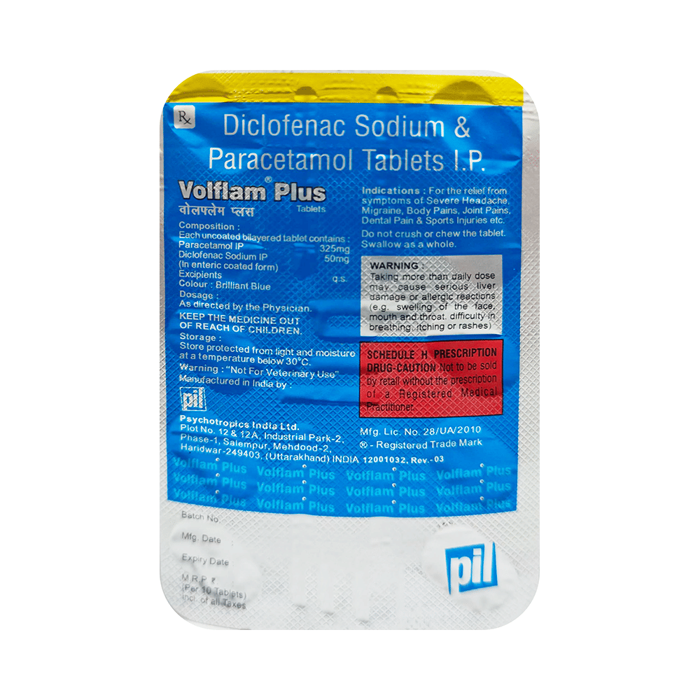 In Pain reliefVolflam Plus 50 mg/325 mg Tablet is a combination of medicines that is used for short-term relief of pain, inflammation and swelling. It inhibits release of those chemical messengers in the brain that tell us that we have pain. It effectively relieves back pain, earache, throat pain, toothache and pain due to arthritis too.Take it as it is prescribed to get the most benefit. Do not take more or for longer than needed as that can be dangerous. In general, you should take the lowest dose that works, for the shortest possible time. This will help you to go about your daily activities more easily and have a better, more active, quality of life.