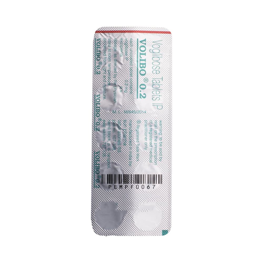 Volibo 0.2 Tablet is a medicine used to treat type 2 diabetes mellitus. It helps control the high blood sugar levels in your body after each meal. It is used when other similar medicines along with a restricted diet, are unable to control abnormally high blood sugar levels. Volibo 0.2 Tablet should be taken just before a meal. The dose and how often you need it will be decided by your doctor so that you get the right amount to control your blood sugar levels. Do not stop taking it suddenly without consulting your doctor. If you do, your blood sugar levels may increase and put you at risk of serious complications like kidney damage and blindness.This medicine is only part of a treatment program that should also include a healthy diet, regular exercise, and weight reduction as advised by your doctor. Monitor your blood sugar levels regularly while taking this medicine.The most common side effects of Volibo 0.2 Tablet include flatulence (gas), stomach pain, loss of appetite, constipation, and diarrhea. Consult your doctor if any of these side effects bother you or do not go away. This medicine by itself does not cause hypoglycemia (low blood sugar levels). However, when used in combination with other diabetes medicines (especially insulin or sulphonylureas), it can lead to hypoglycemia (low blood sugar levels). Such episodes of hypoglycemia will have to be treated by taking plain glucose. Table sugar or common sugar will not help correct low blood sugar levels if you are taking this medicine.Before taking it, let your doctor know if you have any kidney or liver problems. Do not take this medicine if you have ulceration or inflammation in the bowel (eg. ulcerative colitis or Crohn’s disease). Pregnant or breastfeeding women should also consult their doctor before taking it. Please tell your doctor about all the other medicines you are taking to make sure you are safe. Avoid excessive alcohol intake while taking this medicine as it may increase the risk of hypoglycemia (low blood sugar levels).