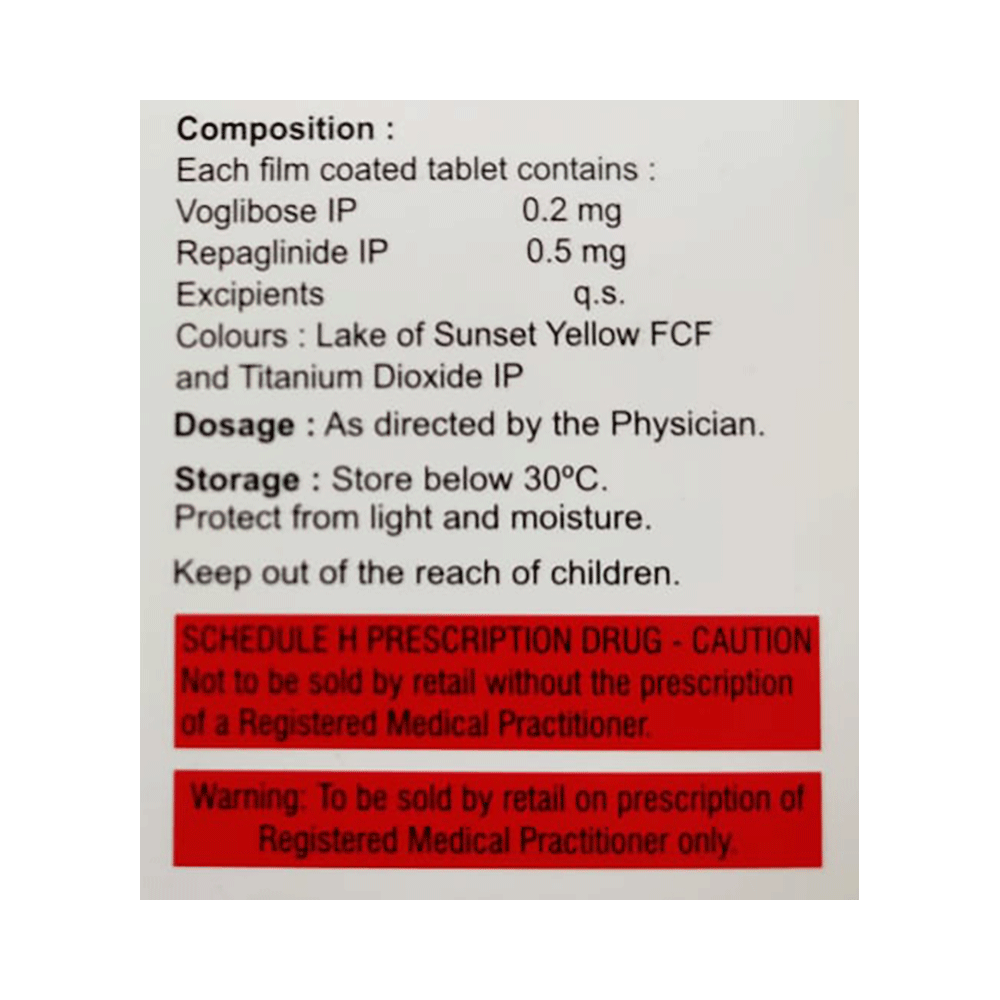 Salt Composition: Repaglinide (0.5mg) + Voglibose (0.2mg)
