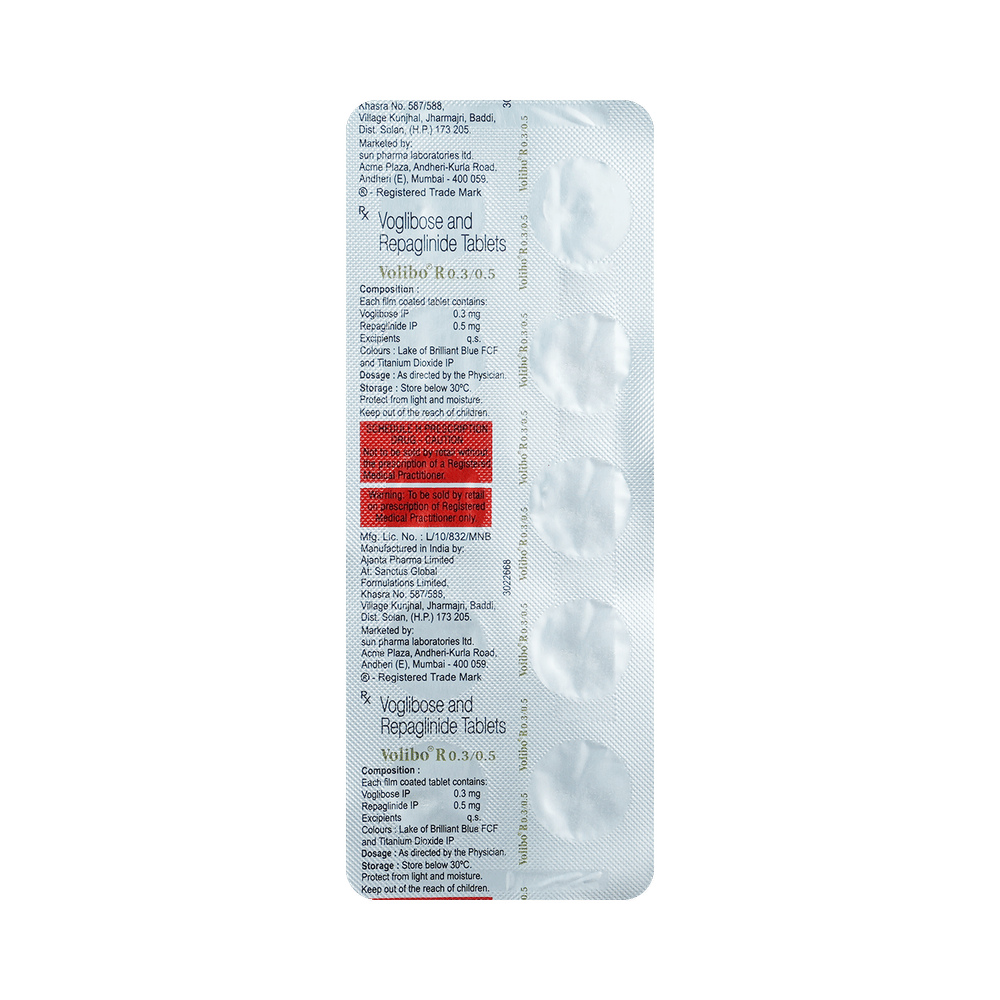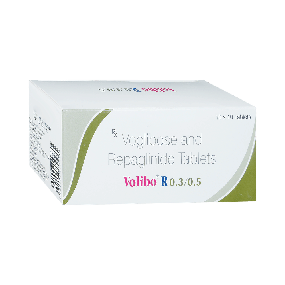 Volibo R 0.5mg/0.3mg Tablet is a combination of two medicines used to treat type 2 diabetes mellitus. It helps control the high blood sugar levels in your body after each meal. It is used when other similar medicines along with a restricted diet, are unable to control abnormally high blood sugar levels. Volibo R 0.5mg/0.3mg Tablet should be taken just after meals. The dose will be decided by your doctor. Do not stop taking it without asking your doctor. If you do, your blood sugar levels may increase and put you at risk of serious complications like kidney damage and blindness. If you miss a dose, do not take the missed dose between two meals. Wait until your next meal and take it just after meals as usual. Do not take a double dose to make up for the missed dose. This medicine is only part of a treatment program that should include a healthy diet, regular exercise, and weight reduction as advised by your doctor.The most common side effects of this medicine include flatulence, diarrhea, stomach pain, hypoglycemia (low blood sugar level), and skin rash. However, these are temporary and usually resolve on their own. Please consult your doctor if these do not resolve or persist for a longer duration. Monitor your blood sugar levels regularly while taking this medicine.Before taking this medicine, inform your doctor if you have any kidney or liver problems or urinary tract infection or if you are on water pills (diuretics). Pregnant or breastfeeding women should also consult their doctor before taking it. Avoid excessive alcohol intake while taking it as this may increase the risk of developing some side effects.