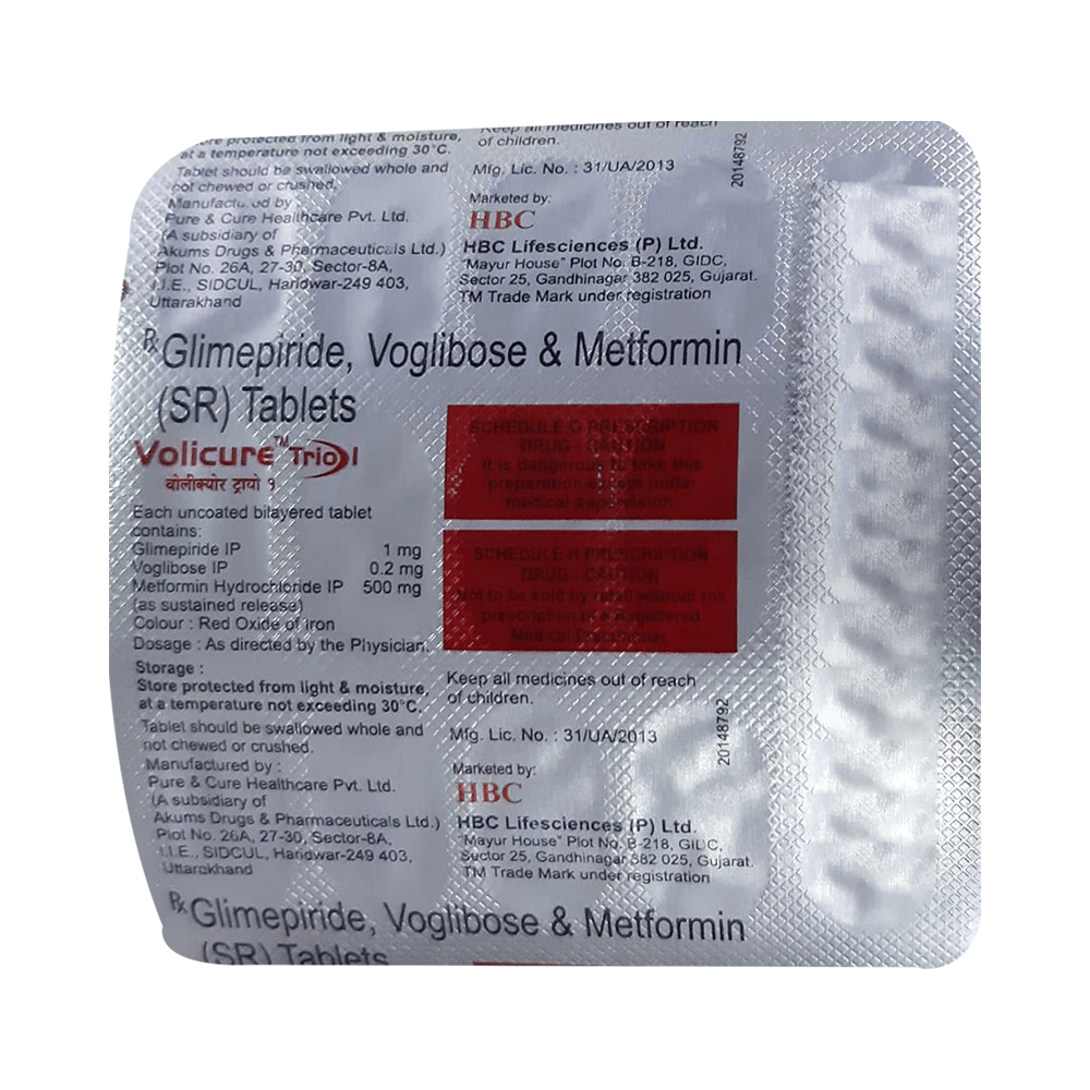 Volicure Trio 1mg/500mg/0.2mg Tablet belongs to a category of medicines known as anti-diabetic drugs. It is a combination of medicines used to treat type 2 diabetes mellitus in adults. It helps control blood sugar levels in people with diabetes. Take Volicure Trio 1mg/500mg/0.2mg Tablet with or immediately before meals. Take it regularly at the same time each day to get the most benefit. Your doctor will decide what dose is best for you, and this may change from time to time depending on how it is working according to your blood sugar levels.Keep taking this medicine, even if you feel well or your blood sugar levels are controlled. If you stop it without consulting your doctor, your blood sugar levels could rise and put you at risk of kidney damage, blindness, nerve problems, and loss of limbs. Remember that it is only part of a treatment program that should also include a healthy diet, regular exercise, and weight reduction as advised by your doctor. Your lifestyle plays a big part in controlling diabetes.Common side effects of Volicure Trio 1mg/500mg/0.2mg Tablet are nausea, vomiting, abdominal pain, and loss of appetite. Make sure you recognize the signs of low blood glucose levels, such as sweating, dizziness, headache, and shaking, and know how to deal with them. To prevent this, it's important to have regular meals and always carry a fast-acting source of glucose, such as sugary food or fruit juice, with you.Drinking alcohol can also increase your risk of low blood sugar levels and should be avoided. Other side effects that may be seen on taking this medicine include taste changes, nausea, diarrhea, stomach pain, headache, edema (swelling), blurred vision, bone fracture, and upper respiratory tract infection. Some people may find that they put on weight with this medicine.You should not take Volicure Trio 1mg/500mg/0.2mg Tablet if you have type 1 diabetes mellitus, if you have diabetic ketoacidosis (high levels of acid in your blood), or if you have severe kidney or liver disease. Before taking this medicine, tell your doctor if you have ever had heart disease, as it may not be suitable. Pregnant or breastfeeding women should also consult their doctor before taking it. Your blood sugar levels should be checked regularly, and your doctor may also advise blood tests to monitor your blood cell counts and liver function.