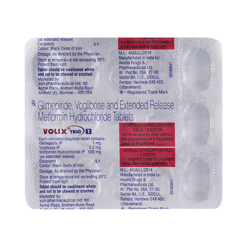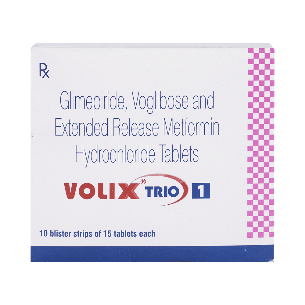 Volix Trio 1 Tablet ER belongs to a category of medicines known as anti-diabetic drugs. It is a combination of medicines used to treat type 2 diabetes mellitus in adults. It helps control blood sugar levels in people with diabetes. Take Volix Trio 1 Tablet ER with or immediately before meals. Take it regularly at the same time each day to get the most benefit. Your doctor will decide what dose is best for you, and this may change from time to time depending on how it is working according to your blood sugar levels.Keep taking this medicine, even if you feel well or your blood sugar levels are controlled. If you stop it without consulting your doctor, your blood sugar levels could rise and put you at risk of kidney damage, blindness, nerve problems, and loss of limbs. Remember that it is only part of a treatment program that should also include a healthy diet, regular exercise, and weight reduction as advised by your doctor. Your lifestyle plays a big part in controlling diabetes.Common side effects of Volix Trio 1 Tablet ER are nausea, vomiting, abdominal pain, and loss of appetite. Make sure you recognize the signs of low blood glucose levels, such as sweating, dizziness, headache, and shaking, and know how to deal with them. To prevent this, it's important to have regular meals and always carry a fast-acting source of glucose, such as sugary food or fruit juice, with you.Drinking alcohol can also increase your risk of low blood sugar levels and should be avoided. Other side effects that may be seen on taking this medicine include taste changes, nausea, diarrhea, stomach pain, headache, edema (swelling), blurred vision, bone fracture, and upper respiratory tract infection. Some people may find that they put on weight with this medicine.You should not take Volix Trio 1 Tablet ER if you have type 1 diabetes mellitus, if you have diabetic ketoacidosis (high levels of acid in your blood), or if you have severe kidney or liver disease. Before taking this medicine, tell your doctor if you have ever had heart disease, as it may not be suitable. Pregnant or breastfeeding women should also consult their doctor before taking it. Your blood sugar levels should be checked regularly, and your doctor may also advise blood tests to monitor your blood cell counts and liver function.