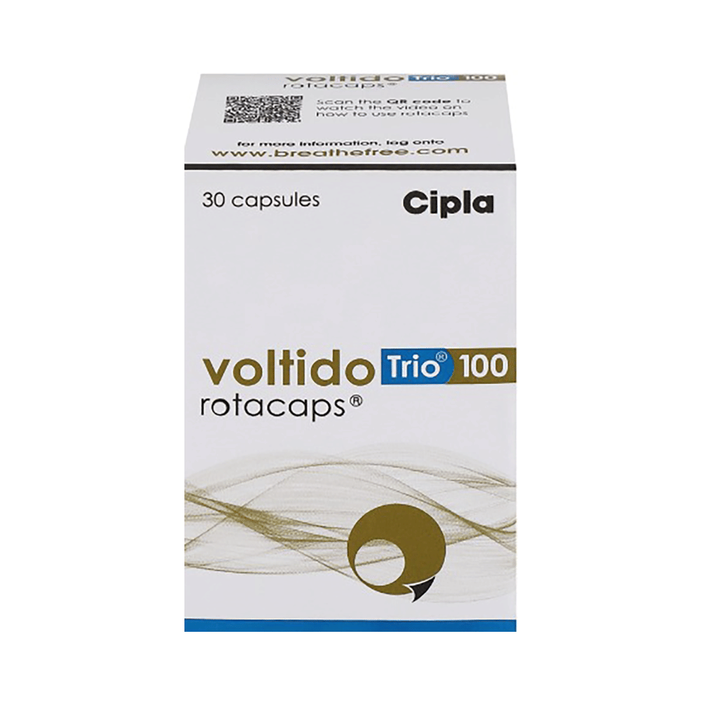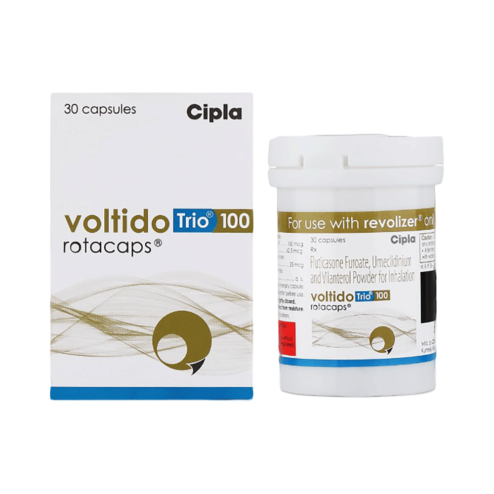 Voltido Trio 100 Rotacap is used in the treatment of chronic obstructive pulmonary disorder (COPD), a lung disorder in which the flow of air to the lung is blocked. It provides relief from COPD symptoms like wheezing, shortness of breath, coughing, and chest tightness. This medicine is for inhalation purposes only. Thus, it should not be taken by mouth. It is important to follow all the guidelines of the doctor before using it. Before using the medicine, the doctor will guide you on how to use this medicine. Use it in the dose and duration advised by the doctor.Common cold is the most common side effect of this medicine. You may also experience side effects like fungal infection of the mouth, infection of the nose, blocked nose, cough, and headache. If any of these side effects persist or get worse, you should let your doctor know.Do not use this medicine without consulting the doctor if you have any problems related to heart, liver, or if you have glaucoma, tuberculosis (TB), asthma, and enlarged prostate.