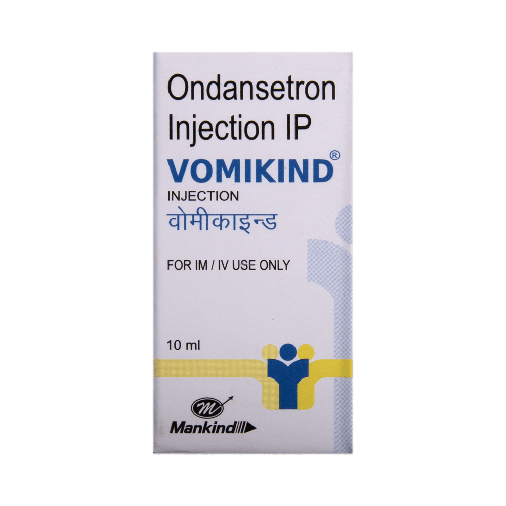 Vomikind Injection is an antiemetic medicine commonly used to control nausea and vomiting due to certain medical conditions like stomach upset. It is also used to prevent nausea and vomiting caused by any surgery, cancer drug therapy, or radiotherapy. Vomikind Injection is given under the supervision of a doctor and may be used alone or with other medications. Your doctor will give you the appropriate dose depending on what you are taking it for. You must keep having the injections until your doctor decides it is safe to stop them. After this, your doctor may prescribe tablets instead of the injections.The most common side effects of taking this medicine include injection site pain, headache, and constipation. These symptoms should disappear when you stop taking the medicine. But if these side effects bother you or do not go away, consult your doctor, who may be able to suggest ways of preventing or reducing them.Before taking this medicine, tell your doctor if you have heart or liver problems or a blockage in your stomach or intestines. Also, tell your doctor about other drugs you are using, especially medicines to treat epilepsy, heart problems, cancer, and depression. These may affect or be affected by this medicine. If you are pregnant or breastfeeding, ask for advice from your doctor.