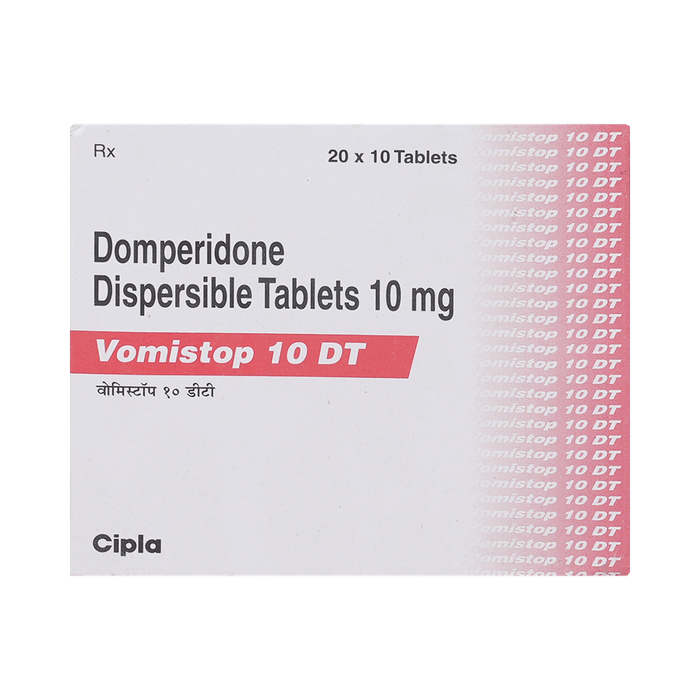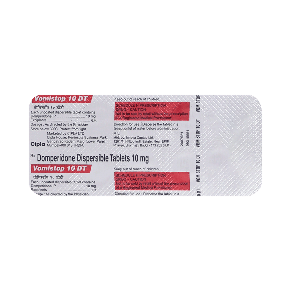 Vomistop 10 DT Tablet is used in the treatment of indigestion, nausea, and vomiting. It increases the movement of food through the stomach and intestines, thereby relieving bloating, fullness, and gastric discomfort. Take Vomistop 10 DT Tablet half an hour before each meal in the dose and duration as advised by the doctor. The dose you are given will depend on your condition and how you respond to the medicine. You should take this medicine until your doctor tells you to stop. Let your doctor know about all other medications you are taking as some may affect, or be affected by this medicine.The most common side effects are headache, dry mouth, and stomach pain. Most of these are temporary and usually resolve with time. Contact your doctor straight away if you are at all concerned about any of these side effects. It may also cause dizziness. Do not drive or do anything that requires mental focus until you know how this medicine affects you. Avoid drinking alcohol while taking this medicine as it can worsen the side effects. This medicine may also cause diarrhea, so it is better to take plenty of fluids while taking this medicine as it may help to prevent dehydration.Before taking this medicine you should let your doctor know if you have liver or kidney problems. You shouldn't take it at the same time as an antacid. Pregnant women should also consult their doctor. You should avoid this medicine if suffering from bleeding ulcers in the stomach.