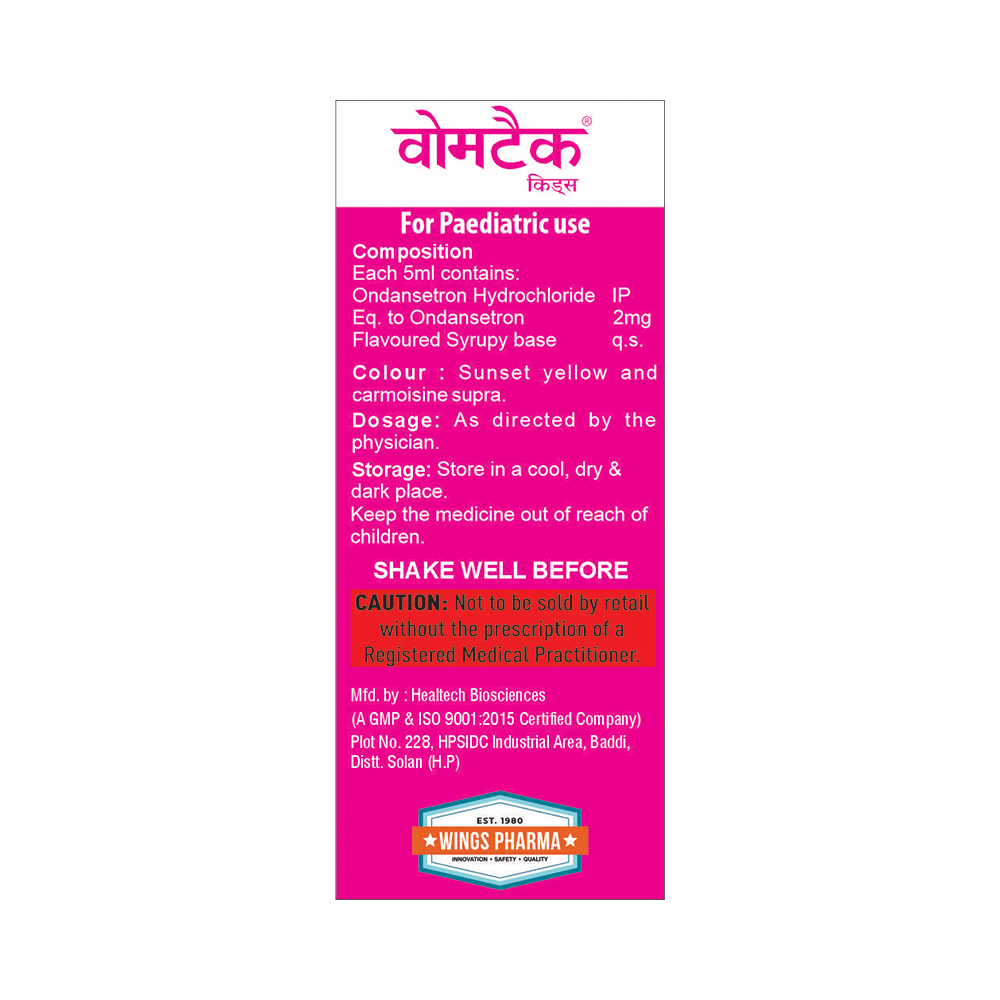 Vomtech Kids Oral Solution is a medicine given to children to help treat nausea and vomiting. It is mainly given to treat nausea and vomiting associated with surgery, chemotherapy, radiotherapy, and stomach/intestinal infection. It also helps treat vomiting that is caused as a side effect of medicines like painkillers. Vomtech Kids Oral Solution may be given before or after meals. To control vomiting caused due to chemotherapy, give this medicine to your child 30 minutes before the procedure. Give it 1 to 2 hours before a radiotherapy session and 1 hour before surgery to prevent your child from vomiting post these procedures. If your child expels out the medicine within 30 minutes of the intake, help your child calm down and repeat the dose. Do not double dose if it is already time for the next dose.Vomtech Kids Oral Solution may cause some temporary side effects such as headache, constipation, diarrhea, and fatigue. These side effects usually subside once your child’s body adapts to the medicine. In case these side effects persist or become bothersome, do reach out to the doctor on a priority basis.Let the doctor know about all the medicines your child is taking, including painkillers, antibiotics, or medicines taken to treat depression. Also, inform the doctor if your child has a history of liver problems, kidney malfunction, blockage in the gastrointestinal tract, heart problems, or allergies to any medicine, its ingredients, or a food product. This information is very important for dose alterations and for planning your child’s overall treatment.