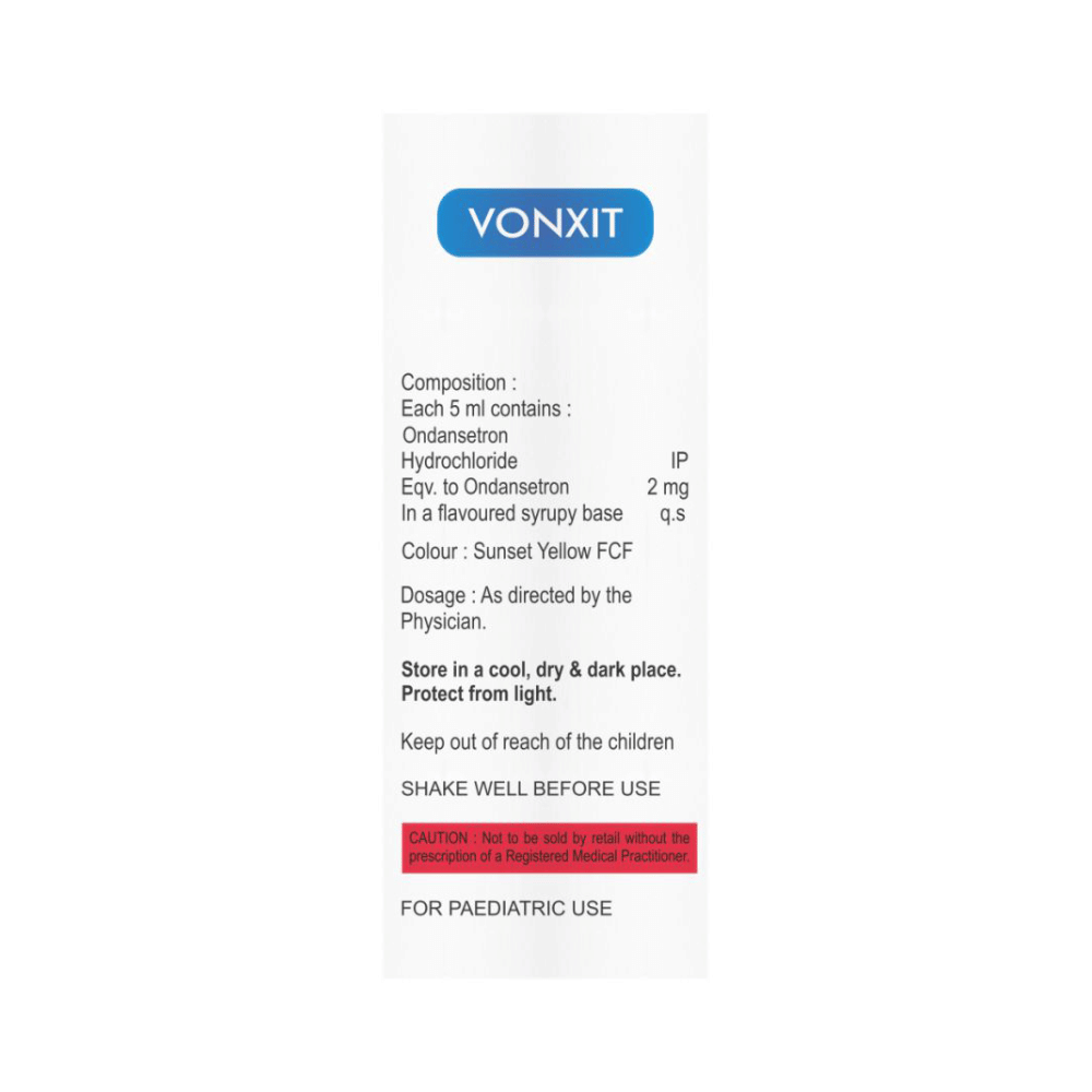 Vonxit Drops Orange is a medicine given to children to help treat nausea and vomiting. It is mainly given to treat nausea and vomiting associated with surgery, chemotherapy, radiotherapy, and stomach/intestinal infection. It also helps treat vomiting that is caused as a side effect of medicines like painkillers. Vonxit Drops Orange may be given before or after meals. To control vomiting caused due to chemotherapy, give this medicine to your child 30 minutes before the procedure. Give it 1 to 2 hours before a radiotherapy session and 1 hour before surgery to prevent your child from vomiting post these procedures. If your child expels out the medicine within 30 minutes of the intake, help your child calm down and repeat the dose. Do not double dose if it is already time for the next dose.Vonxit Drops Orange may cause some temporary side effects such as headache, constipation, diarrhea, and fatigue. These side effects usually subside once your child’s body adapts to the medicine. In case these side effects persist or become bothersome, do reach out to the doctor on a priority basis.Let the doctor know about all the medicines your child is taking, including painkillers, antibiotics, or medicines taken to treat depression. Also, inform the doctor if your child has a history of liver problems, kidney malfunction, blockage in the gastrointestinal tract, heart problems, or allergies to any medicine, its ingredients, or a food product. This information is very important for dose alterations and for planning your child’s overall treatment.