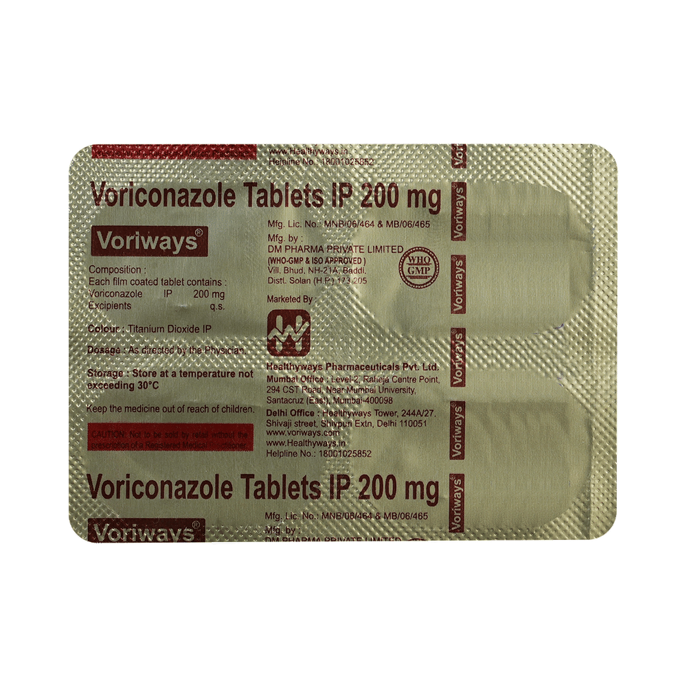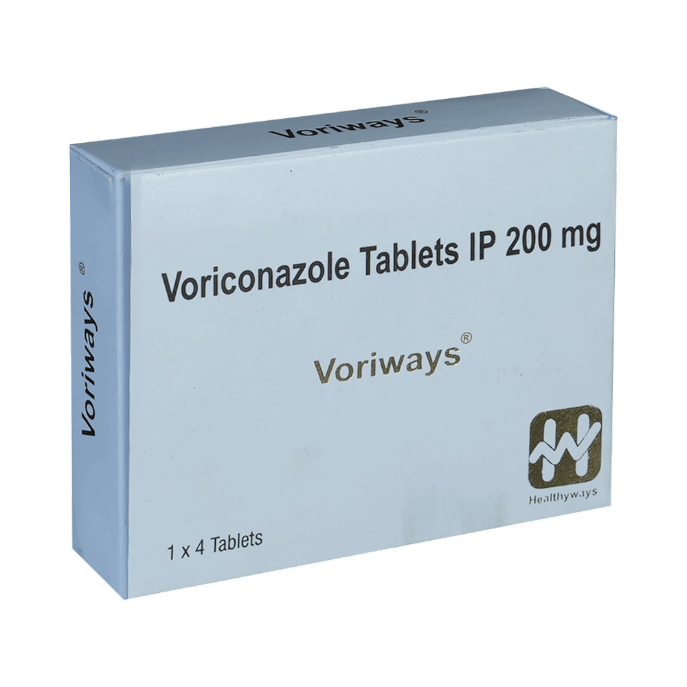 Voriways Tablet belongs to a group of medicines called antifungals. It works by stopping the growth of fungus and is used to treat a wide range of fungal infections. It kills fungi by destroying the fungal cell membrane. Voriways Tablet should be taken in the dose and duration as prescribed by your doctor. It should be swallowed whole. It should be taken one hour before or one hour after a meal. The dosage and length of treatment will depend on the condition you are being treated for. Sometimes this will be in cycles of use and non-use. To get the most benefit, take this medicine at evenly spaced times and continue using it until your prescription is finished, even if your symptoms disappear after a few days. If you stop treatment too early, the infection may return and if you miss doses you can increase your risk of infections that are resistant to further treatment. Tell your doctor if the infection does not get better or if it gets worse.The most common side effects of this medicine include rash, vomiting, nausea, and headache. These are not usually serious, but you should call your doctor if you think you might have a severe allergic reaction. Signs of this include rash, swelling of the lips, throat or face, swallowing or breathing problems, feeling dizzy or faint, and nausea. Get emergency help if this happens.Do not take it if you are pregnant or could become pregnant unless your doctor has told you to. Talk to your doctor before taking it if you have ever had heart failure, a weak immune system (including HIV/AIDS), kidney problems, or liver problems such as yellow skin (jaundice). This medicine may not be suitable for you. If your course of treatment is for more than a month, your doctor may want to check your liver by testing your blood. This medicine may make you dizzy or have blurred vision so do not drive or operate machines until it is safe.