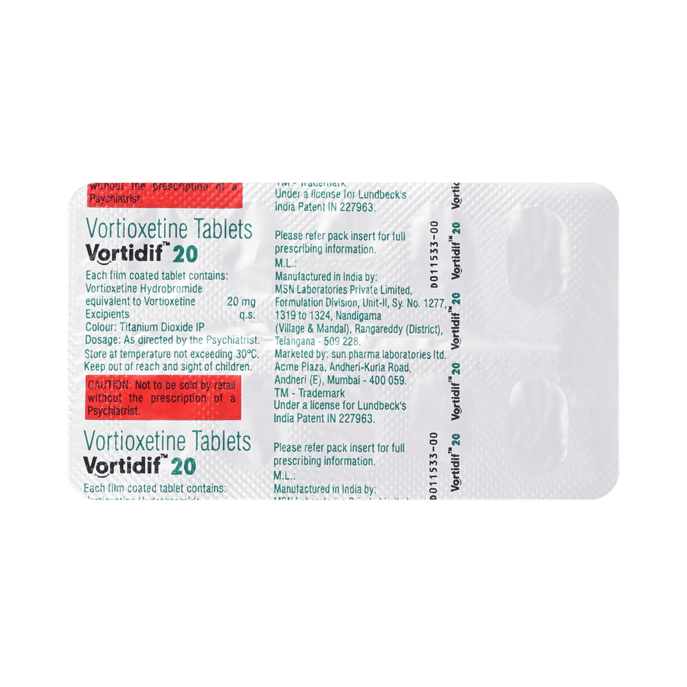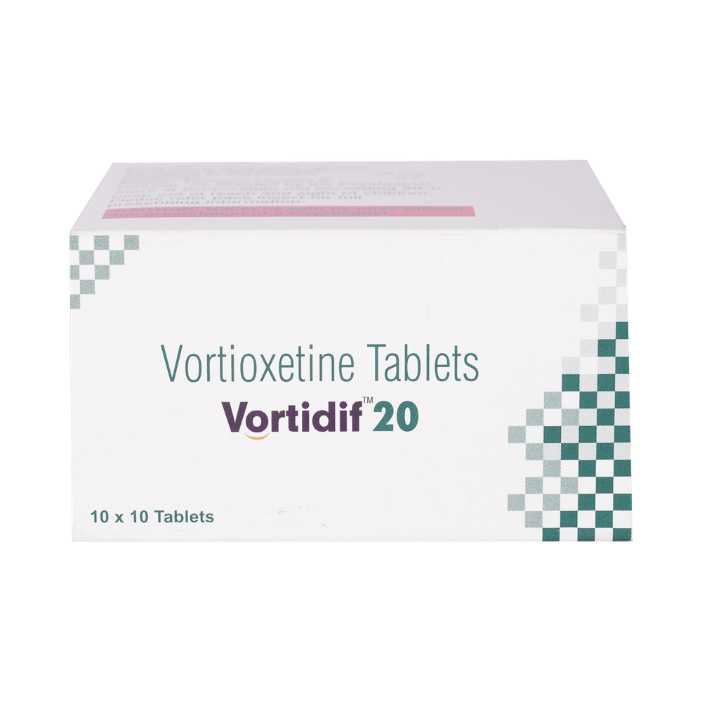 Vortidif 20mg Tablet is a medicine prescribed to treat depression in adults. It belongs to a group of antidepressants known as serotonin modulator and stimulator (SMS). This medication helps to improve mood and energy levels, and reduce sadness and feelings of worthlessness in people with depression. Vortidif 20mg Tablet may be taken with or without food but take it at the same time each day to get the most benefit. The dose and how often you need it will be decided by your doctor so that you get the right amount to control your symptoms. It may be increased gradually. If you have trouble sleeping it may be best to take this medicine in the morning. It may take a few weeks before you start to feel better. Do not change the dose or stop taking it without talking to your doctor, even if you feel well. Your condition may get worse or you may suffer unpleasant withdrawal symptoms. Let your doctor know if you do not see any improvement after four weeks.Some common side effects of this medicine include vomiting, nausea, and constipation. Keep taking the medicine but talk to a doctor if these side effects bother you. There may be ways of preventing or reducing them. You should avoid driving or operating machinery until you know how this medicine affects you.Before taking it, you should tell your doctor if you have epilepsy, diabetes, liver or kidney disease, heart problems, glaucoma, drug addiction or bipolar disorder. These may affect your treatment. Pregnant or breastfeeding women should also consult their doctor before taking it. Some other medicines may affect the way it works, especially other antidepressants and medicines called MAO inhibitors. Please tell your doctor about all the medicines you are taking to make sure you are safe.