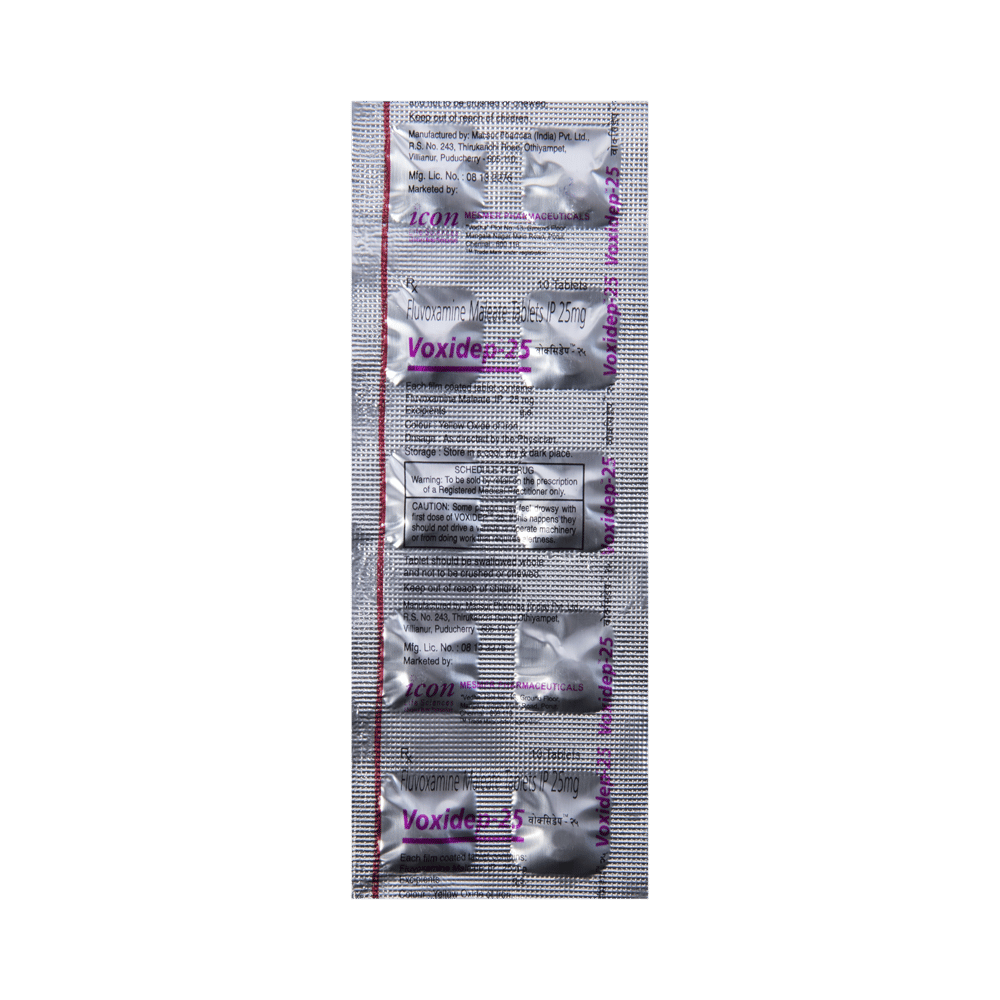 VOXIdep 25 Tablet is a type of antidepressant belonging to the selective serotonin reuptake inhibitor (SSRI) group of medicines. It is prescribed to treat depression, where it helps to make you feel better. This medicine is also used to treat people with obsessive-compulsive disorder. VOXIdep 25 Tablet can be taken with or without food. The dose and how often you need it will be decided by your doctor so that you get the right amount to control your symptoms. Your doctor may start you on a lower dose and increase it gradually. Do not change the dose or stop taking it without talking to your doctor, even if you feel well. Doing so may make your condition worse or you may suffer from unpleasant withdrawal symptoms (anxiety, restlessness, palpitations, dizziness, sleep disturbances, etc).To get the most benefit, take this medicine regularly at the same time each day. It may take a few weeks before you start feeling better. Let your doctor know if you do not see any improvement even after 4 weeks.VOXIdep 25 Tablet has been reported to have fewer side effects than older antidepressants. Some common side effects of this medicine include nausea, vomiting, fatigue, dry mouth, increased sweating, tremors, insomnia (difficulty in sleeping), decreased sexual drive, delayed ejaculation, and erectile dysfunction. Some people may experience sleepiness after taking this medicine. Let your doctor know if you develop any sudden worsening of mood or any thoughts about harming yourself.Before taking this medicine, you should tell your doctor if you have epilepsy (seizure disorder or fits), diabetes, liver or kidney disease, heart problems, or glaucoma. These may affect your treatment. Pregnant or breastfeeding women should also consult their doctor before taking it. Some other medicines may affect the way it works, especially other antidepressants and medicines called MAO inhibitors. Please tell your doctor about all the medicines you are taking to make sure you are safe.