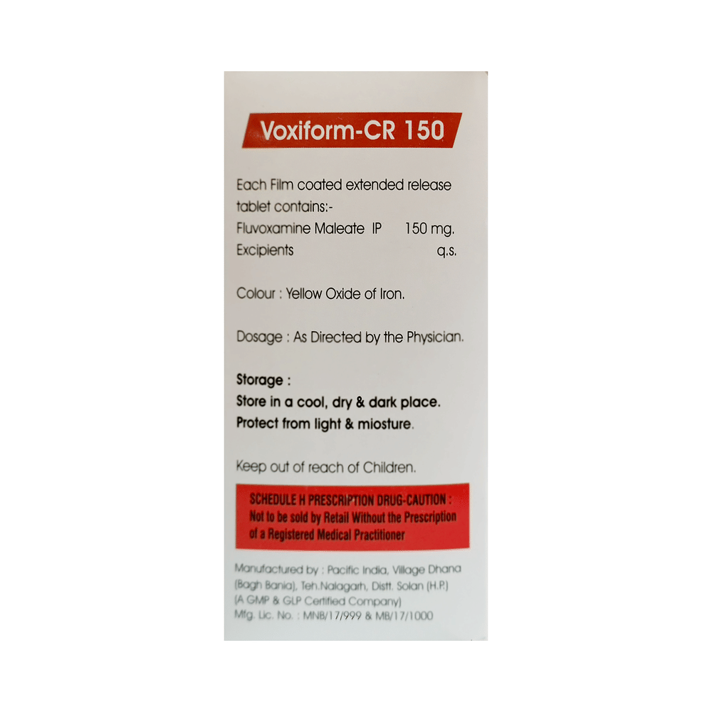 Voxiform-CR 150 Tablet is a type of antidepressant belonging to the selective serotonin reuptake inhibitor (SSRI) group of medicines. It is prescribed to treat depression, where it helps to make you feel better. This medicine is also used to treat people with obsessive-compulsive disorder. Voxiform-CR 150 Tablet can be taken with or without food. The dose and how often you need it will be decided by your doctor so that you get the right amount to control your symptoms. Your doctor may start you on a lower dose and increase it gradually. Do not change the dose or stop taking it without talking to your doctor, even if you feel well. Doing so may make your condition worse or you may suffer from unpleasant withdrawal symptoms (anxiety, restlessness, palpitations, dizziness, sleep disturbances, etc).To get the most benefit, take this medicine regularly at the same time each day. It may take a few weeks before you start feeling better. Let your doctor know if you do not see any improvement even after 4 weeks.Voxiform-CR 150 Tablet has been reported to have fewer side effects than older antidepressants. Some common side effects of this medicine include nausea, vomiting, fatigue, dry mouth, increased sweating, tremors, insomnia (difficulty in sleeping), decreased sexual drive, delayed ejaculation, and erectile dysfunction. Some people may experience sleepiness after taking this medicine. Let your doctor know if you develop any sudden worsening of mood or any thoughts about harming yourself.Before taking this medicine, you should tell your doctor if you have epilepsy (seizure disorder or fits), diabetes, liver or kidney disease, heart problems, or glaucoma. These may affect your treatment. Pregnant or breastfeeding women should also consult their doctor before taking it. Some other medicines may affect the way it works, especially other antidepressants and medicines called MAO inhibitors. Please tell your doctor about all the medicines you are taking to make sure you are safe.