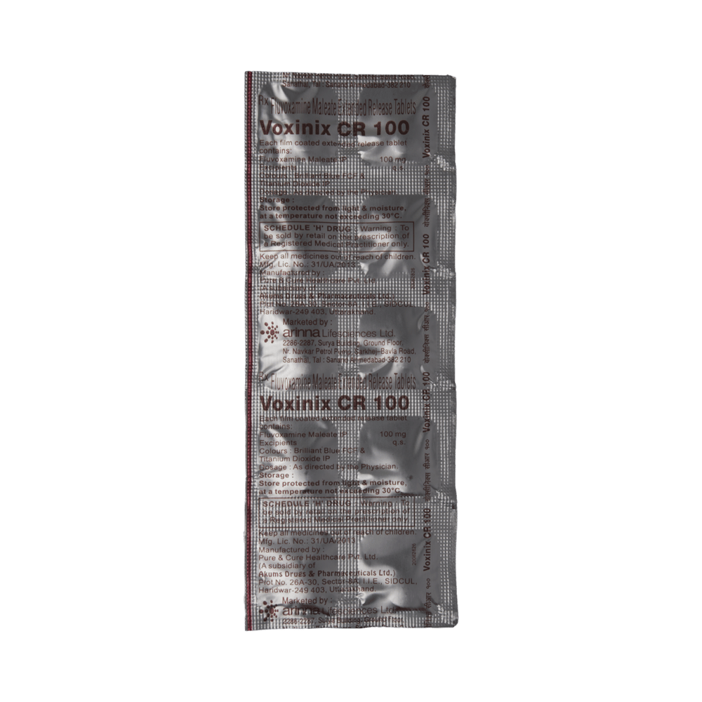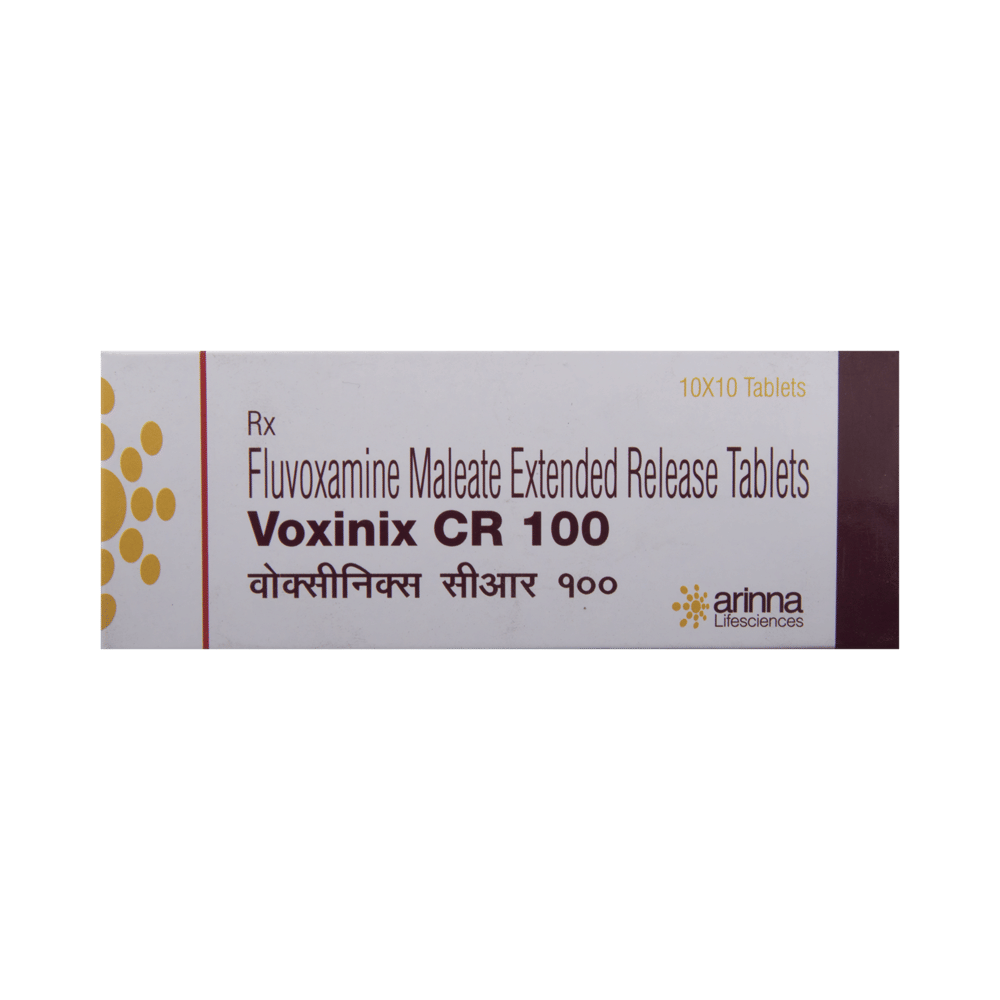 Voxinix CR 100 Tablet is a selective serotonin reuptake inhibitor (SSRI) antidepressant. It works by increasing the levels of serotonin, a chemical messenger in the brain. This improves mood and physical symptoms of depression and also relieves symptoms of obsessive-compulsive disorders.