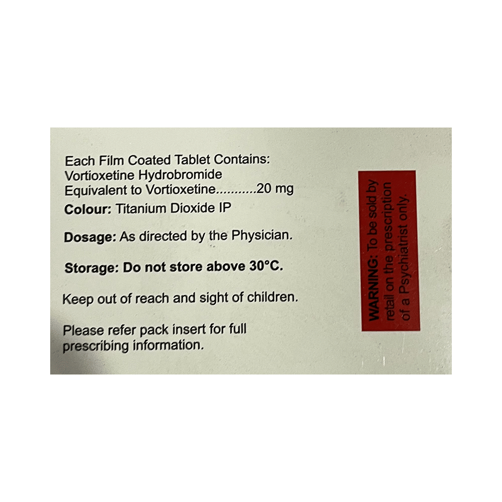 Voxitin 20 Tablet is a medicine prescribed to treat depression in adults. It belongs to a group of antidepressants known as serotonin modulator and stimulator (SMS). This medication helps to improve mood and energy levels, and reduce sadness and feelings of worthlessness in people with depression. Voxitin 20 Tablet may be taken with or without food but take it at the same time each day to get the most benefit. The dose and how often you need it will be decided by your doctor so that you get the right amount to control your symptoms. It may be increased gradually. If you have trouble sleeping it may be best to take this medicine in the morning. It may take a few weeks before you start to feel better. Do not change the dose or stop taking it without talking to your doctor, even if you feel well. Your condition may get worse or you may suffer unpleasant withdrawal symptoms. Let your doctor know if you do not see any improvement after four weeks.Some common side effects of this medicine include vomiting, nausea, and constipation. Keep taking the medicine but talk to a doctor if these side effects bother you. There may be ways of preventing or reducing them. You should avoid driving or operating machinery until you know how this medicine affects you.Before taking it, you should tell your doctor if you have epilepsy, diabetes, liver or kidney disease, heart problems, glaucoma, drug addiction or bipolar disorder. These may affect your treatment. Pregnant or breastfeeding women should also consult their doctor before taking it. Some other medicines may affect the way it works, especially other antidepressants and medicines called MAO inhibitors. Please tell your doctor about all the medicines you are taking to make sure you are safe.