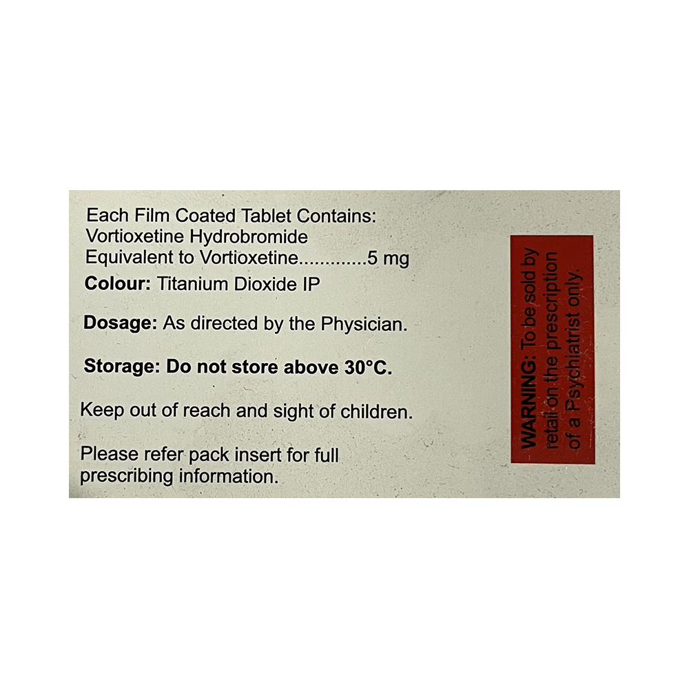 Voxitin 5 Tablet is a medicine prescribed to treat depression in adults. It belongs to a group of antidepressants known as serotonin modulator and stimulator (SMS). This medication helps to improve mood and energy levels, and reduce sadness and feelings of worthlessness in people with depression. Voxitin 5 Tablet may be taken with or without food but take it at the same time each day to get the most benefit. The dose and how often you need it will be decided by your doctor so that you get the right amount to control your symptoms. It may be increased gradually. If you have trouble sleeping it may be best to take this medicine in the morning. It may take a few weeks before you start to feel better. Do not change the dose or stop taking it without talking to your doctor, even if you feel well. Your condition may get worse or you may suffer unpleasant withdrawal symptoms. Let your doctor know if you do not see any improvement after four weeks.Some common side effects of this medicine include vomiting, nausea, and constipation. Keep taking the medicine but talk to a doctor if these side effects bother you. There may be ways of preventing or reducing them. You should avoid driving or operating machinery until you know how this medicine affects you.Before taking it, you should tell your doctor if you have epilepsy, diabetes, liver or kidney disease, heart problems, glaucoma, drug addiction or bipolar disorder. These may affect your treatment. Pregnant or breastfeeding women should also consult their doctor before taking it. Some other medicines may affect the way it works, especially other antidepressants and medicines called MAO inhibitors. Please tell your doctor about all the medicines you are taking to make sure you are safe.