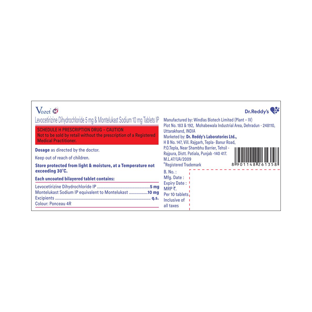 Vozet M 5mg/10mg Tablet is a combination medicine used in the treatment of allergic symptoms such as runny nose, stuffy nose, sneezing, itching, swelling, watery eyes and congestion or stuffiness. It also reduces inflammation in the airways and make breathing easier. Vozet M 5mg/10mg Tablet is taken with or without food in a dose and duration as advised by the doctor. The dose you are given will depend on your condition and how you respond to the medicine. You should keep taking this medicine for as long as your doctor recommends. If you stop treatment too early your symptoms may come back and your condition may worsen. Let your healthcare team know about all other medications you are taking as some may affect, or be affected by this medicine.The most common side effects are nausea, diarrhea, vomiting, dryness in the mouth, headache, skin rash, flu-like symptoms, and fatigue. Most of these are temporary and usually resolve with time. Contact your doctor straight away if you are at all concerned about any of these side effects. This medicine may cause dizziness and sleepiness, so do not drive or do anything that requires mental focus until you know how this medicine affects you. Avoid drinking alcohol while taking this medicine as it can worsen your sleepiness.Never support self-medication or recommend your medicine to another person. It is beneficial to have plenty of fluids while taking this medication. Before you start taking this medicine it is important to inform your doctor if you are suffering from kidney disease.