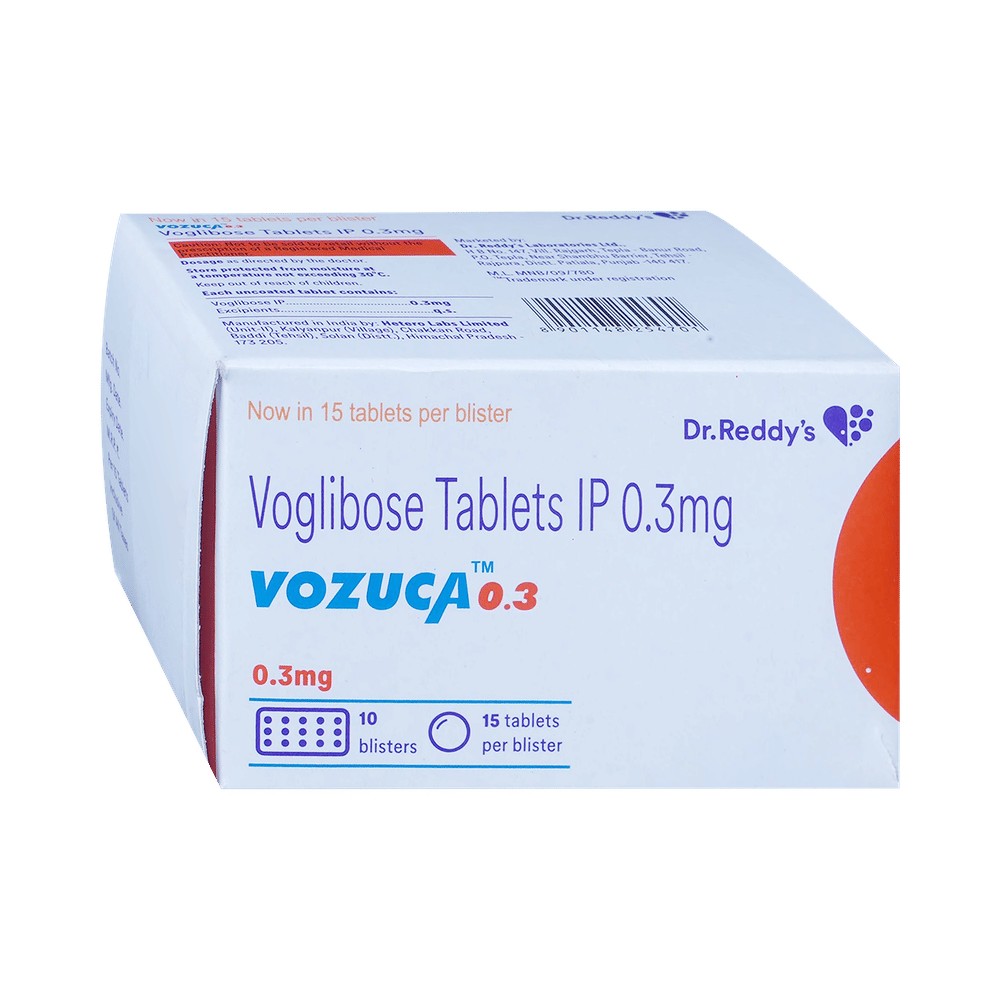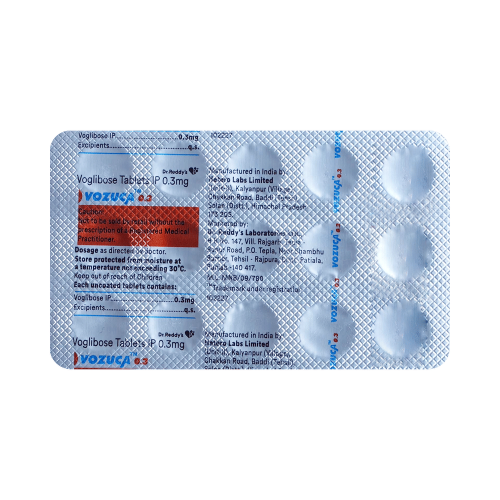 Vozuca 0.3 Tablet is a medicine used to treat type 2 diabetes mellitus. It helps control the high blood sugar levels in your body after each meal. It is used when other similar medicines along with a restricted diet, are unable to control abnormally high blood sugar levels. Vozuca 0.3 Tablet should be taken just before a meal. The dose and how often you need it will be decided by your doctor so that you get the right amount to control your blood sugar levels. Do not stop taking it suddenly without consulting your doctor. If you do, your blood sugar levels may increase and put you at risk of serious complications like kidney damage and blindness.This medicine is only part of a treatment program that should also include a healthy diet, regular exercise, and weight reduction as advised by your doctor. Monitor your blood sugar levels regularly while taking this medicine.The most common side effects of Vozuca 0.3 Tablet include flatulence (gas), stomach pain, loss of appetite, constipation, and diarrhea. Consult your doctor if any of these side effects bother you or do not go away. This medicine by itself does not cause hypoglycemia (low blood sugar levels). However, when used in combination with other diabetes medicines (especially insulin or sulphonylureas), it can lead to hypoglycemia (low blood sugar levels). Such episodes of hypoglycemia will have to be treated by taking plain glucose. Table sugar or common sugar will not help correct low blood sugar levels if you are taking this medicine.Before taking it, let your doctor know if you have any kidney or liver problems. Do not take this medicine if you have ulceration or inflammation in the bowel (eg. ulcerative colitis or Crohn’s disease). Pregnant or breastfeeding women should also consult their doctor before taking it. Please tell your doctor about all the other medicines you are taking to make sure you are safe. Avoid excessive alcohol intake while taking this medicine as it may increase the risk of hypoglycemia (low blood sugar levels).