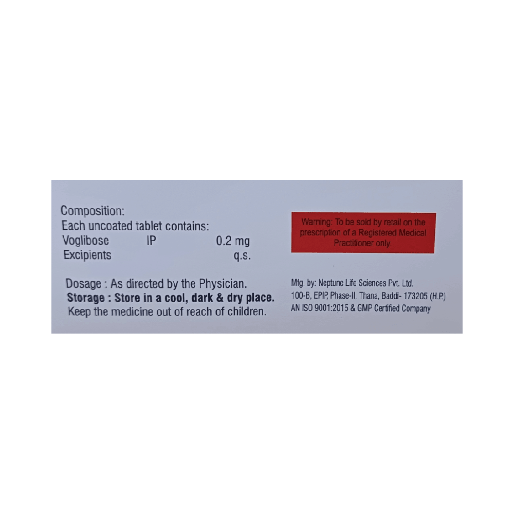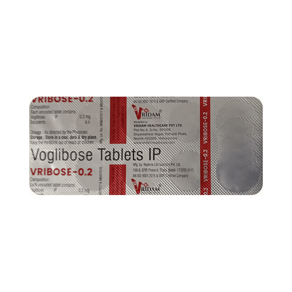 Vribose 0.2 Tablet is a medicine used to treat type 2 diabetes mellitus. It helps control the high blood sugar levels in your body after each meal. It is used when other similar medicines along with a restricted diet, are unable to control abnormally high blood sugar levels. Vribose 0.2 Tablet should be taken just before a meal. The dose and how often you need it will be decided by your doctor so that you get the right amount to control your blood sugar levels. Do not stop taking it suddenly without consulting your doctor. If you do, your blood sugar levels may increase and put you at risk of serious complications like kidney damage and blindness.This medicine is only part of a treatment program that should also include a healthy diet, regular exercise, and weight reduction as advised by your doctor. Monitor your blood sugar levels regularly while taking this medicine.The most common side effects of Vribose 0.2 Tablet include flatulence (gas), stomach pain, loss of appetite, constipation, and diarrhea. Consult your doctor if any of these side effects bother you or do not go away. This medicine by itself does not cause hypoglycemia (low blood sugar levels). However, when used in combination with other diabetes medicines (especially insulin or sulphonylureas), it can lead to hypoglycemia (low blood sugar levels). Such episodes of hypoglycemia will have to be treated by taking plain glucose. Table sugar or common sugar will not help correct low blood sugar levels if you are taking this medicine.Before taking it, let your doctor know if you have any kidney or liver problems. Do not take this medicine if you have ulceration or inflammation in the bowel (eg. ulcerative colitis or Crohn’s disease). Pregnant or breastfeeding women should also consult their doctor before taking it. Please tell your doctor about all the other medicines you are taking to make sure you are safe. Avoid excessive alcohol intake while taking this medicine as it may increase the risk of hypoglycemia (low blood sugar levels).
