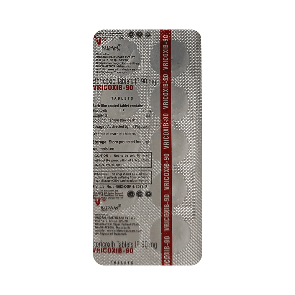 Vricoxib 90 Tablet is a pain-relieving medicine. It is used for relieving moderate pain and swelling of joints associated with different forms of gout and arthritis. It effectively alleviates pain, redness, and swelling. Vricoxib 90 Tablet can be taken with or without food. The dose depends on what you are taking it for and how well it helps your symptoms. You should take it as advised by your doctor. Do not take more or use it for longer than recommended.The most common side effects of this medicine include stomach pain, edema, dizziness, headache, irregular heartbeat, and increased blood pressure. These are not usually serious, but if you are worried, ask your doctor about ways of reducing or preventing them.Before taking it, you should let your doctor know if you have a history of ulcers or bleeding in your stomach, high blood pressure, or any trouble with your heart, kidneys, or liver. Let your doctor also know about all the other medicines you are taking because they may affect, or be affected by, this medicine.Pregnant or breastfeeding women should consult their doctor before starting treatment. You should also avoid drinking alcohol while you are taking this medicine. Heavy drinking can cause excessive drowsiness.