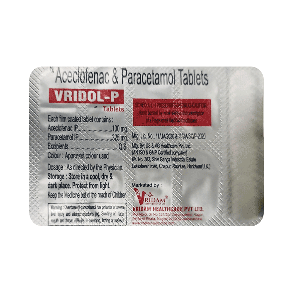 Vridol-P Tablet is a combination of two medicines: Aceclofenac and Paracetamol. These medicines work by blocking the action of chemical messengers responsible for pain, fever and inflammation (redness and swelling).