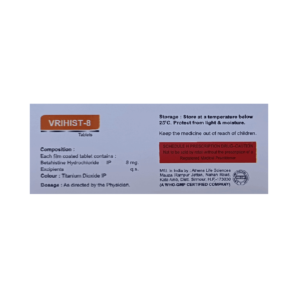 Vrihist 8 Tablet is used to prevent and treat a disorder of the inner ear known as Ménière’s disease. The symptoms include dizziness (vertigo), ringing in the ears (tinnitus), and loss of hearing, probably caused by fluid in the ear. This medicine helps relieve the symptoms by reducing the amount of fluid. Vrihist 8 Tablet should be swallowed whole with water and taken at the same time(s) each day to get the most benefit. Your doctor will decide what is the correct dose to relieve your symptoms and how often you need to take it. You may need to take this medicine for several months and you should take it for as long as prescribed by your doctor, even if you start feeling better. The most common side effects include headache, feeling sick, and indigestion (dyspepsia). You may also get stomach pain and bloating. Taking the medicine with food can help reduce stomach problems. Before taking this medicine, you should talk to your doctor if you have a stomach ulcer, asthma, or high or low blood pressure. You must also tell him/her what other medicines you are taking, to make sure you are safe. Also speak to your doctor if you are pregnant, trying to become pregnant, or breastfeeding.