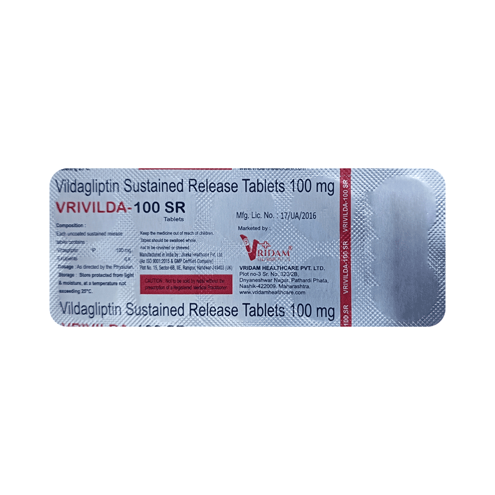Vrivilda 100 SR Tablet is a medicine used to treat type 2 diabetes mellitus. It is used together with a healthy diet and regular exercise to control blood sugar levels. This helps to prevent serious complications of diabetes like kidney damage and blindness. Vrivilda 100 SR Tablet is normally prescribed when diet and exercise alone or other medicines do not prove sufficient to control your blood sugar level. It may prescribe alone or in combination with other diabetes medicines. It can be taken with or without food. The dose will depend on your condition and blood sugar levels. Use it strictly as advised by your doctor.You should take it regularly at the same time each day to get the most benefit. Do not stop taking the medicine unless advised by your doctor. It is important to stay on the diet and exercise program recommended by your doctor while taking this medicine. Your lifestyle plays a big part in controlling diabetes.The most common side effects of Vrivilda 100 SR Tablet include hypoglycemia, tremor, headache, dizziness, fatigue, and nausea. It is important to recognize the symptoms of hypoglycemia (such as lightheadedness, sweating, dizziness, fainting, and dry mouth) and know how to deal with it. You can carry sugar or glucose candy and have them to control your symptoms if you experience any. Contact your doctor if the side effects do not go away or worry you.Before taking this medicine, let your doctor know if you have ever had kidney disease, heart disease, or pancreas problems. Pregnant or breastfeeding women should also consult their doctor before taking it. Some other medicines you are taking may interfere with this medicine's working. So, make sure your doctor knows about all the other medicines you are using. Limit your alcohol intake while taking this medicine because it can increase your risk of developing low blood sugar levels. You may need regular tests such as kidney function and blood glucose levels to check that the medicine is working properly.