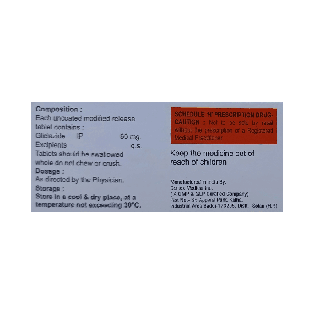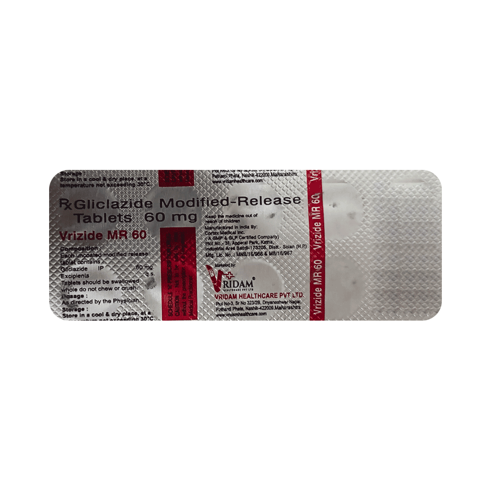 Vrizide MR 60 Tablet is a medicine used to treat type 2 diabetes mellitus in adults. It belongs to a group of medicines called sulfonylureas and helps control blood sugar levels in people with diabetes. This helps prevent serious complications of diabetes. Vrizide MR 60 Tablet may be prescribed alone or along with other medicines. It should be taken with food. Take it regularly at the same time each day to get the most benefit. Your doctor will decide what dose is best for you, which may change from time to time according to how it works. Continue using this medicine as prescribed, even if you feel fine or your blood sugar levels are stable. If you stop it without consulting your doctor, your blood sugar levels could rise and put you at risk of kidney damage, blindness, and nerve problems.Keep in mind that this medicine is just one part of your treatment plan. It should be combined with a healthy diet, regular exercise, and weight management as recommended by your doctor. Your lifestyle plays a crucial role in managing diabetes.The most common side effects of taking this medicine include diarrhea and headaches. It can also cause low blood glucose levels (hypoglycemia). Make sure you recognize the signs of having low blood glucose levels, such as sweating, dizziness, headache, and shaking. You must know how to deal with it.To prevent hypoglycemic conditions, have regular meals and always carry a fast-acting source of glucose, such as sugary food or fruit juice, with you. Consuming alcohol can raise the risk of low blood sugar and should be avoided. Additionally, some individuals may experience weight gain while taking this medicine. You should not take Vrizide MR 60 Tablet if you have type 1 diabetes mellitus, diabetic ketoacidosis (high levels of acid in your blood), or severe kidney or liver disease.Before taking this medicine, tell your doctor if you have ever had heart disease, thyroid disease, or some hormonal conditions. It may not be suitable. Pregnant or breastfeeding women should also consult their doctor before taking it. Regularly monitor your blood sugar levels, and your doctor may recommend blood tests to check your blood cell counts and liver function.