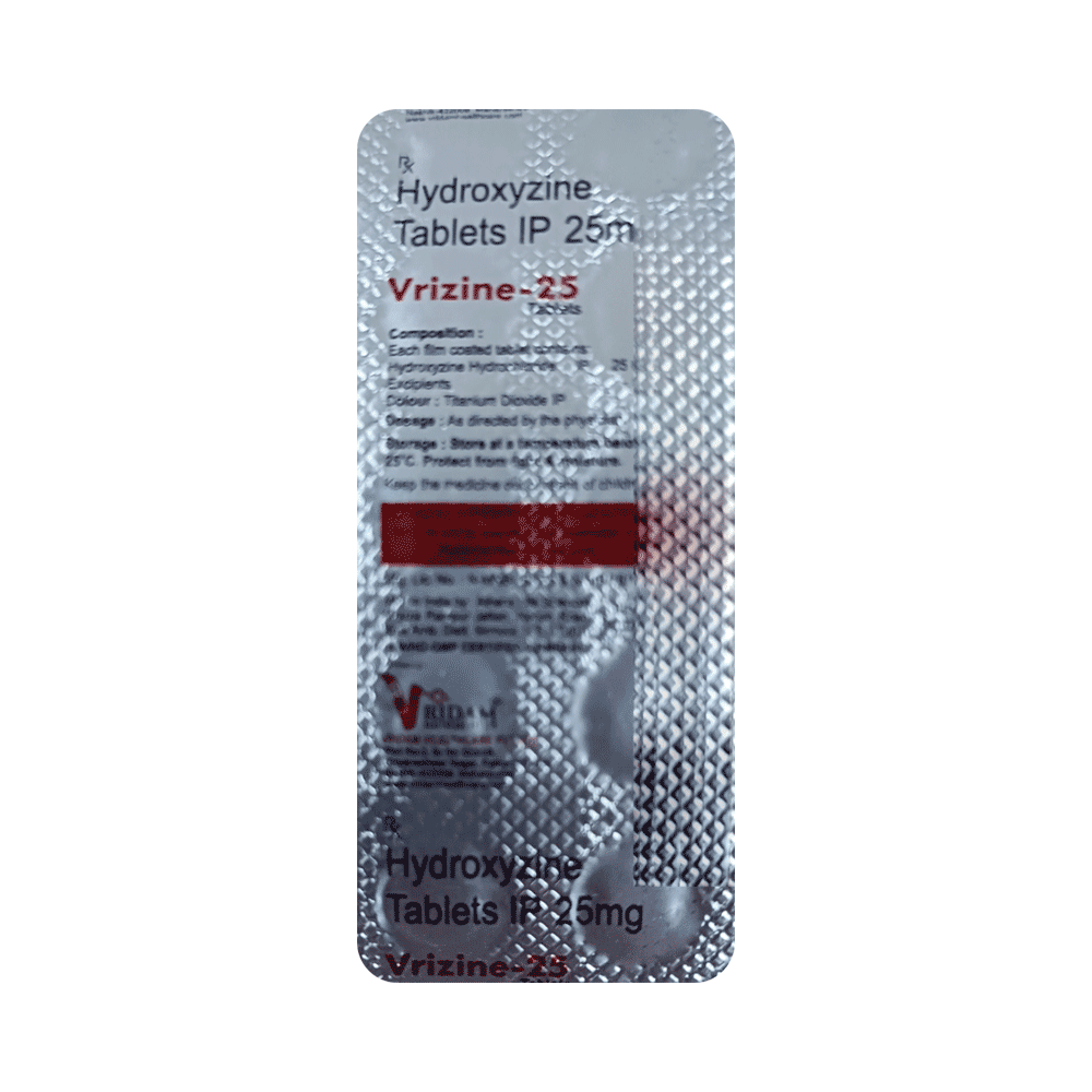Vrizine 25 Tablet is used to treat symptoms of skin allergy like itching, swelling, and rashes in conditions such as eczema, dermatitis, and psoriasis. It is also used to treat anxiety and helps to relax before or after surgery. Vrizine 25 Tablet should be taken with or without food. Take it exactly as your doctor has prescribed. The dose and how often you take it depend on what you are taking it for. Your doctor will decide how much you need to improve your symptoms. Take it for as long as it is prescribed for you. In case you have missed any doses, take the next dose as soon as you remember it. However, you should never take a double dose.The most common side effects of this medicine include drowsiness, dizziness, blurred vision, constipation, and dry mouth. If these bother you or appear serious, let your doctor know. There may be ways of reducing or preventing them.Before taking this medicine, let your doctor know if you have heart problems, high blood pressure, or liver or kidney problems. Inform your doctor if you are pregnant or breastfeeding. Your doctor should also know about all other medicines you are taking, as many of these may make this medicine less effective or change the way it works. Generally, it is advised to avoid alcohol while on treatment.