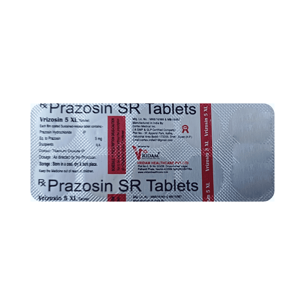 Vrizosin 5 XL Tablet is used to treat high blood pressure by relaxing blood vessels, allowing blood to flow more easily. It is also used to treat symptoms of an enlarged prostate gland (benign prostatic hyperplasia) in men by relaxing the muscles in the prostate and bladder neck, making it easier to urinate. Controlling high blood pressure (hypertension) lowers the risk of having a heart attack or stroke. This medicine may also be used to treat Raynaud's disease. It may be prescribed alone or in combination with other medicines. Take it regularly and take it in the dose and duration prescribed by your doctor. High blood pressure does not usually have symptoms, so keep taking it even if you feel well.The most common side effects of this medicine include weakness, dizziness, headache, nausea, and unusual beating of the heart (palpitation). Most side effects disappear when you get used to the medicine. It may also cause your blood pressure to go too low, especially when you first start taking this medicine. Your doctor may be able to help with ways of preventing or reducing these side effects.If you are pregnant, thinking about becoming pregnant, or breastfeeding, ask your doctor before using this medicine. Also, inform your doctor if you have a history of heart failure, liver disease, or kidney disease, and if you are having eye surgery for a cataract. Your blood pressure will need to be checked regularly while using this medicine.