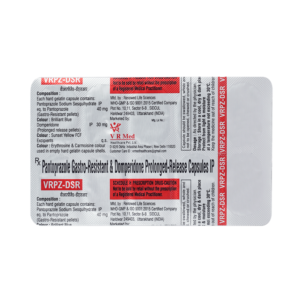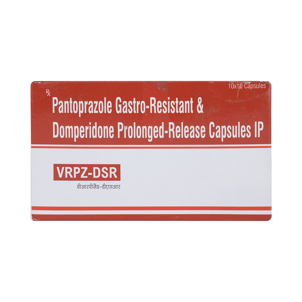 Vrpz-DSR Capsule is a medicine that is used to treat conditions like acid reflux disease (GERD), erosive esophagitis, gastritis, gastric and duodenal ulcers, and indigestion with symptoms like heartburn, bloating, and regurgitation. It works by lowering acid production and helping the stomach empty faster. Take Vrpz-DSR Capsule exactly as prescribed by your doctor, usually once daily before breakfast. Swallow it whole with water; do not crush or chew. To get the best results, maintain a healthy diet, avoid late-night meals, caffeine, spicy or oily foods, and stop smoking or alcohol use. Do not skip doses or stop early, even if you feel better, as that may lead to a return of the symptoms.The most common side effect of Vrpz-DSR Capsule is dry mouth. It may also cause headache, dizziness, diarrhea, nausea, or mild stomach discomfort in some people. These are usually temporary. If you experience persistent vomiting, irregular heartbeat, rash, or severe diarrhea, contact your doctor immediately. Staying hydrated and taking the medicine before meals may help reduce stomach-related side effects.Inform your doctor about any liver, kidney, or heart problems before starting Vrpz-DSR Capsule. Avoid taking it with other drugs that may affect heart rhythm or interact with domperidone or pantoprazole. Do not use it if you have a history of gastrointestinal bleeding or obstruction, or if you are allergic to any of the ingredients in the medicine. Pregnant or breastfeeding women should consult their doctor before use.
